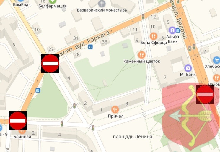 Закрыт заезд на стоянку со стороны улицы Белова. На время городских торжеств перекрывается движение автотранспорта на участке улицы Брестской от пересечения с улицей Горького до площади и на участке улицы Зои Космодемьянской от пересечения с улицей Горького до площади.