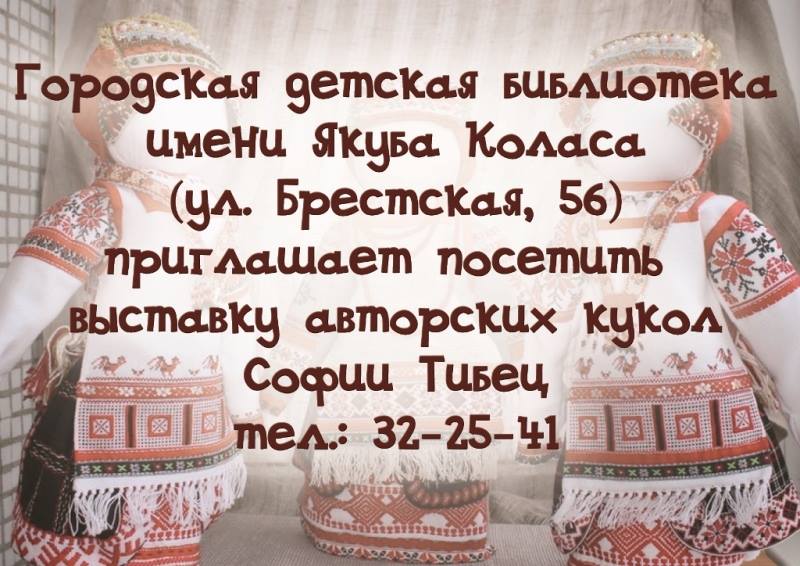 Выстава этнаграфічнай калекцыі лялек Сафіі Тыбец працуе у Гарадской дзіцячай бібліятыцы па адрасу вул. Брэсцкая, 56. Тэлефон для даведак 32 -25 -41.