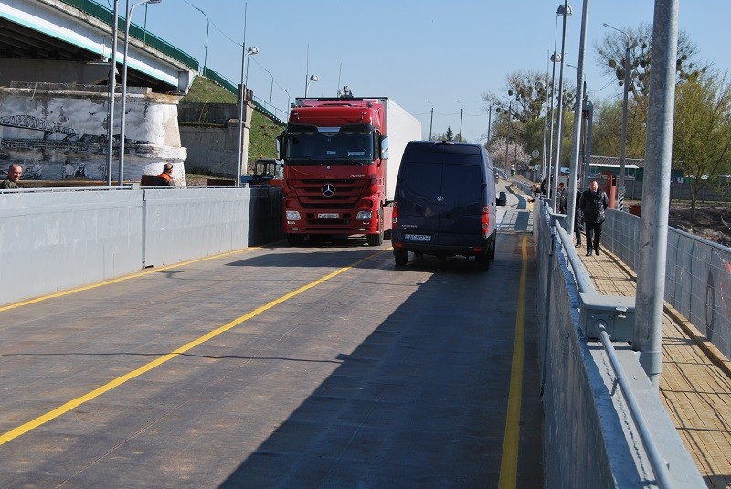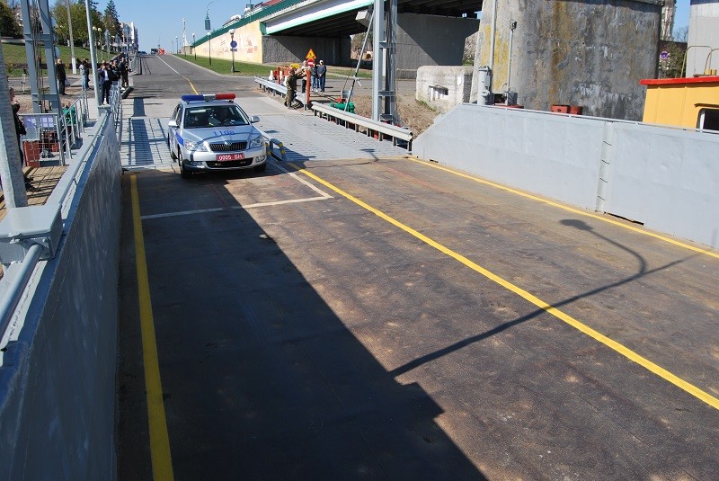 Временный наплавной мост – понтонное сооружение длиной 50 метров, шириной проезжей части 6 метров, с двумя полосами движения, с допустимой нагрузкой на ось 11,5 тонн. Расчетная пропускная способность – 8976 автомобилей в сутки. Ширина пешеходного прохода – 1,5 метра.