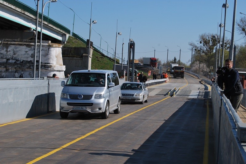 Наплавной мост установлен параллельно существующему. Соединение с существующей дорожной сетью осуществляется при помощи береговых опор и аппарелей.