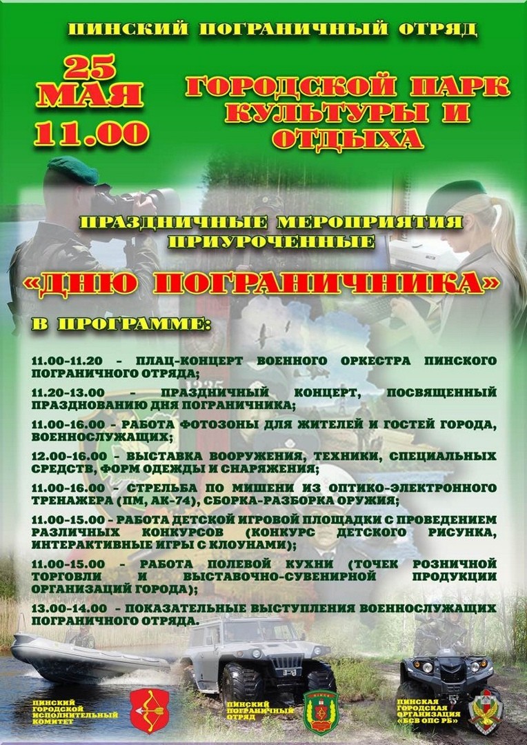 «В преддверии нашего праздника мы подготовили для пинчан насыщенную программу. Гости нашего мероприятия увидят плац-концерт военного оркестра Пинского погранотряда, выставку вооружения техники, специальных средств, форм одежды и снаряжения. На территории парка будет работать тир, где каждый желающий может поучиться собрать – разобрать оружие, а также пострелять по мишеням из оптико-электронного тренажёра пистолета Макарова и автомата Калашникова. Не менее увлекательную программу мы подготовили для тех, кто придёт с детьми. Для юных участников будут организованы интерактивные площадки с аниматорами и конкурсами. Будут работать полевая кухня и торговые точки».