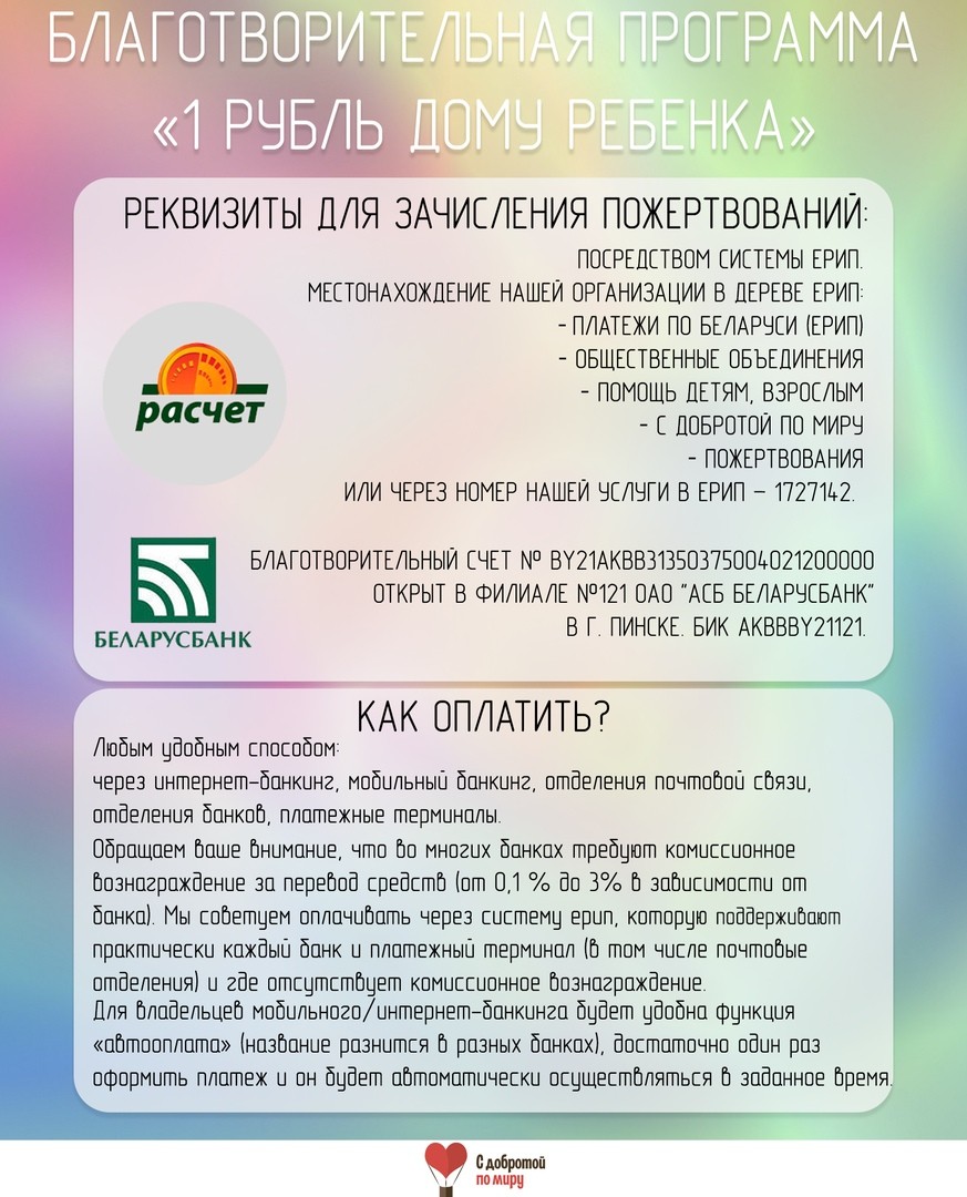 «Условия просты: каждый месяц любым удобным способом вы просто будете переводить 1 рубль, который, объединяясь с пожертвованиями других участников программы, превратится в большую сумму. Перевод пожертвований можно совершать в любом отделении банка, почтового отделения или используя интернет-банкинг (через ЕРИП).