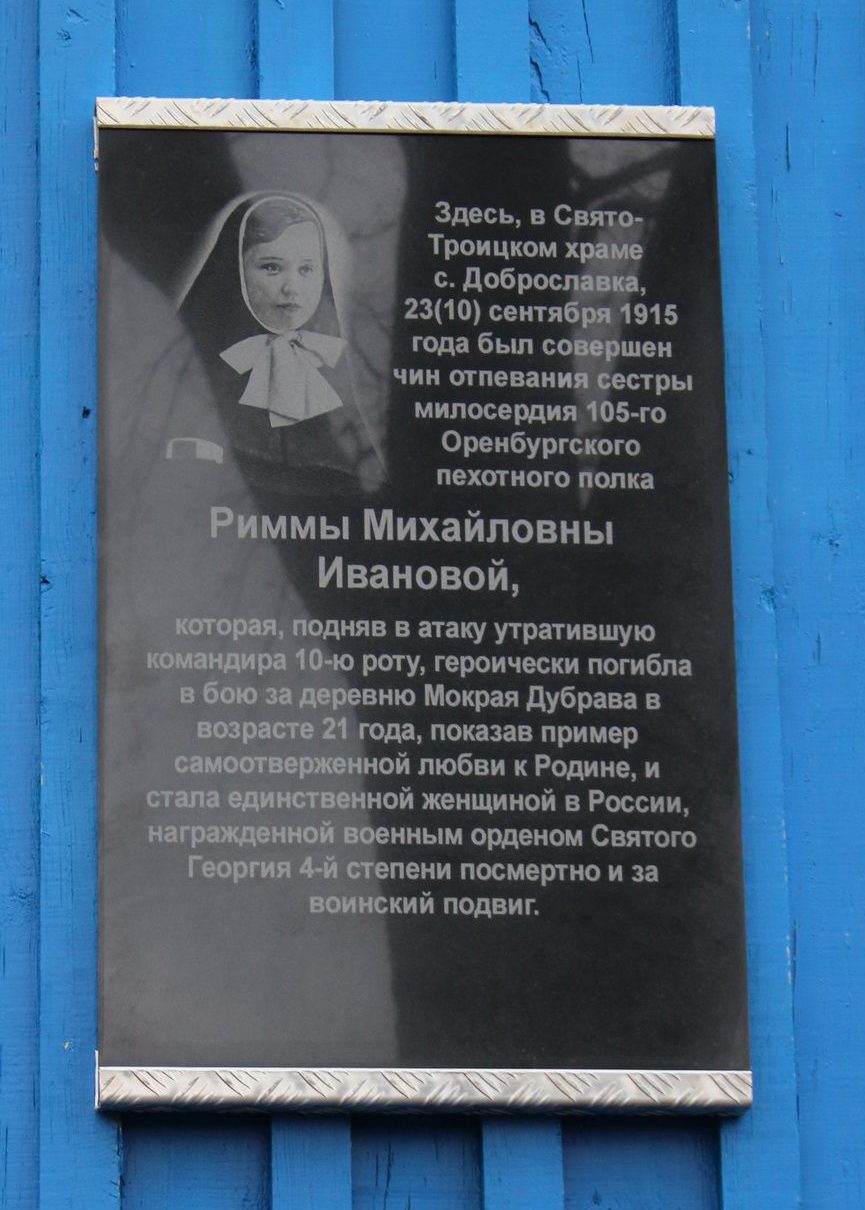 В Первую мировую войну на Полесье погибла Римма Иванова, единственная в России женщина, награждённая военным орденом Святого Георгия 4-й степени. Известно, что она погибла в бою, когда подняла в атаку паникующих солдат. В ее честь установлена мемориальная доска на церкви в деревне Доброславка.