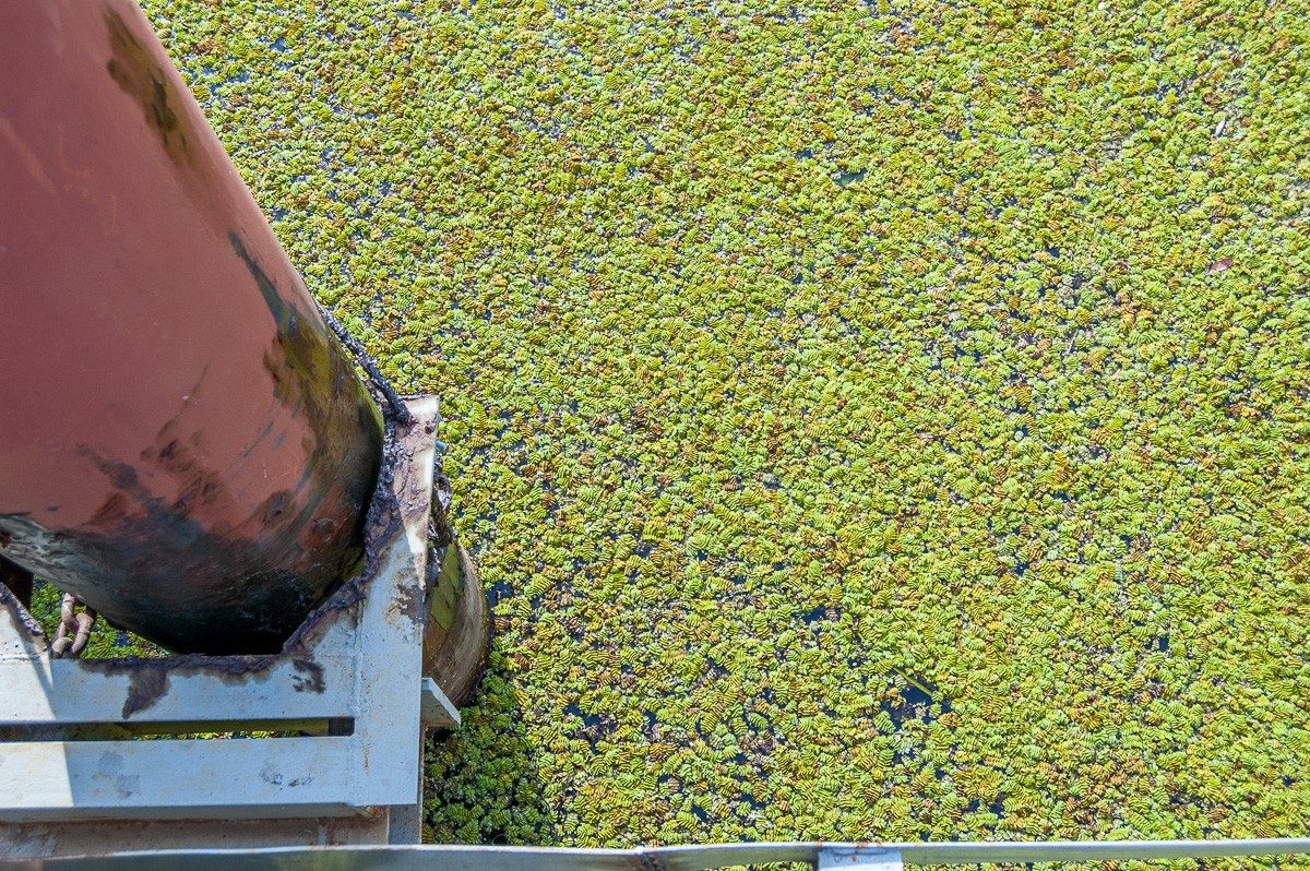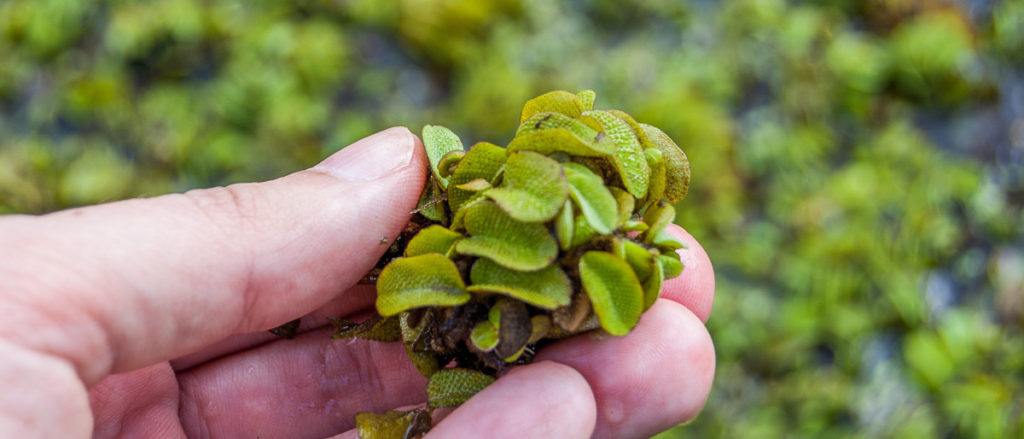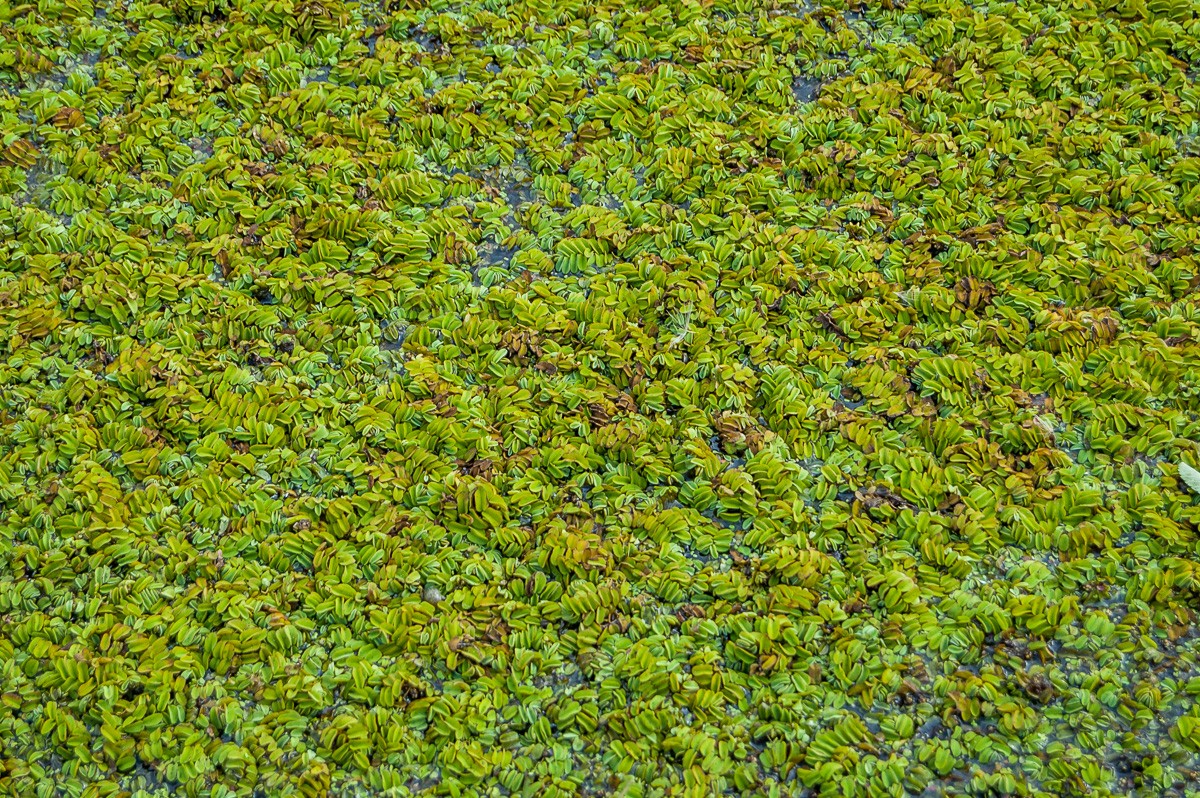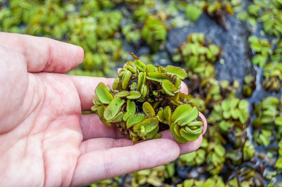 Оказывается, что это зеленое «поле» — не что иное, как целое сообщество водных растений. Среди них ряска малая, многокоренник обыкновенный и сальвиния плавающая.