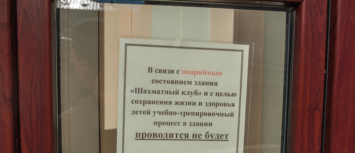 «В связи с аварийным состоянием здания «Шахматный клуб» и с целью сохранения жизни и здоровья детей учебно-тренировочный процесс в здании проводиться не будет.» — так гласит объявление на здании. Эту информацию подтвердил и директор СДЮШОР №2 Виктор Мозоль. Связано это с наличием трещины, которая хорошо видна и распространилась сразу на две стены. Напомним, что в 2010 году уже проводился капитальный ремонт здания.