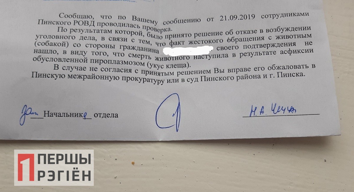 Однако, вскоре свидетельницей был получен письменный ответ от правоохранителей, в котором утверждалось, что собака погибла «от укуса клеща».