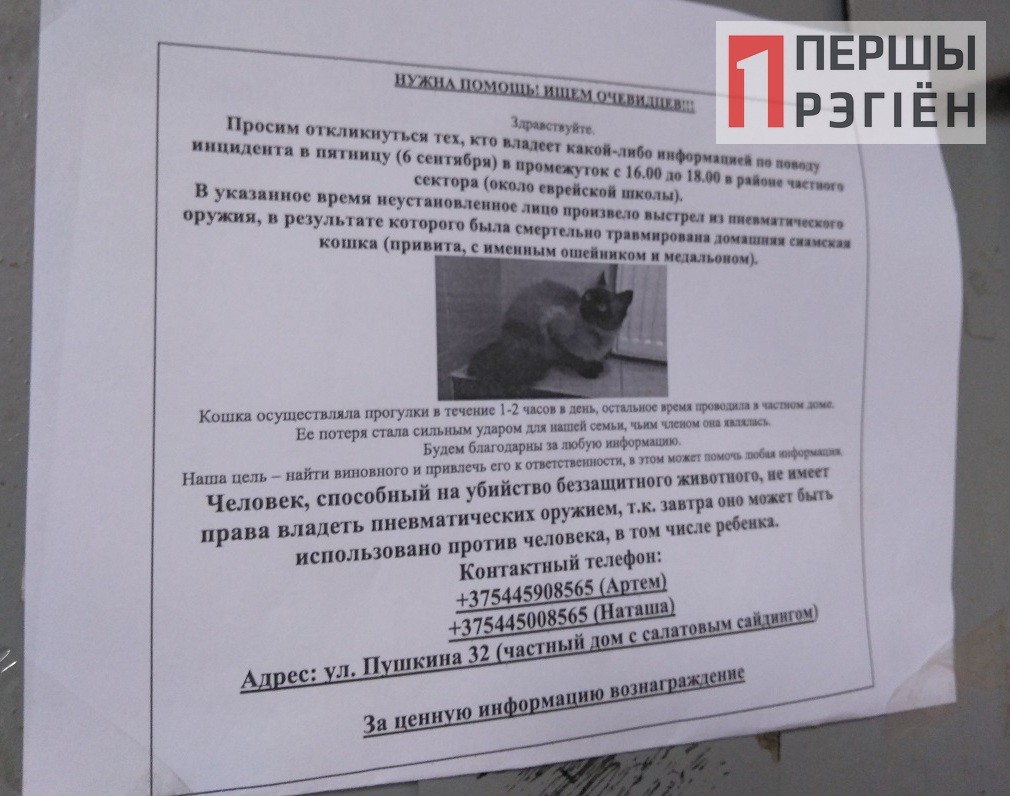-Часто у нас в группе «Защита животных в Пинске» появляются сообщения, что в животных стреляют из пневматического оружия. За последнее время так погиб один котенок, повреждена челюсть у другой кошки. Но люди не хотят писать заявление. Люди не хотят обращаться в милицию, они не верят в то, что чего- то можно добиться. По одному из таких дел была только формальная проверка, которая состояла из опроса соседей, и дело было закрыто,- говорит председатель Пинского городского благотворительного общественного объединения «Защита животных» Елена Романович.