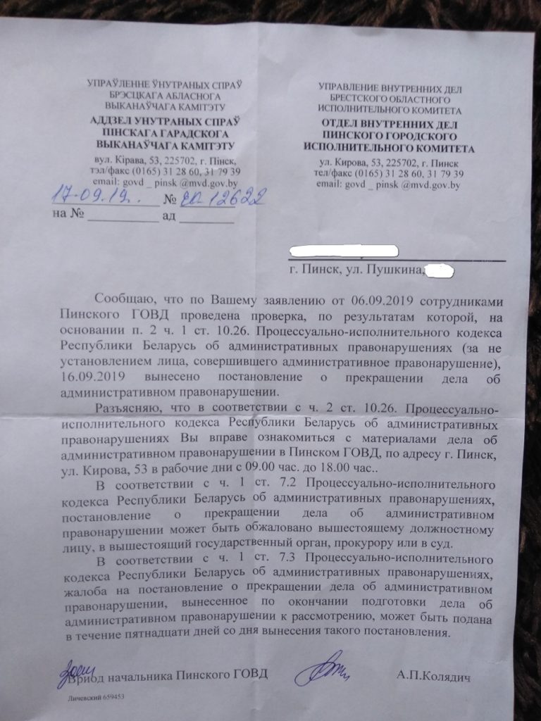 Вскоре семейная пара получила официальный ответ от правоохранителей о том, что дело прекращено «за не установлением лица, совершившего административное правонарушение».