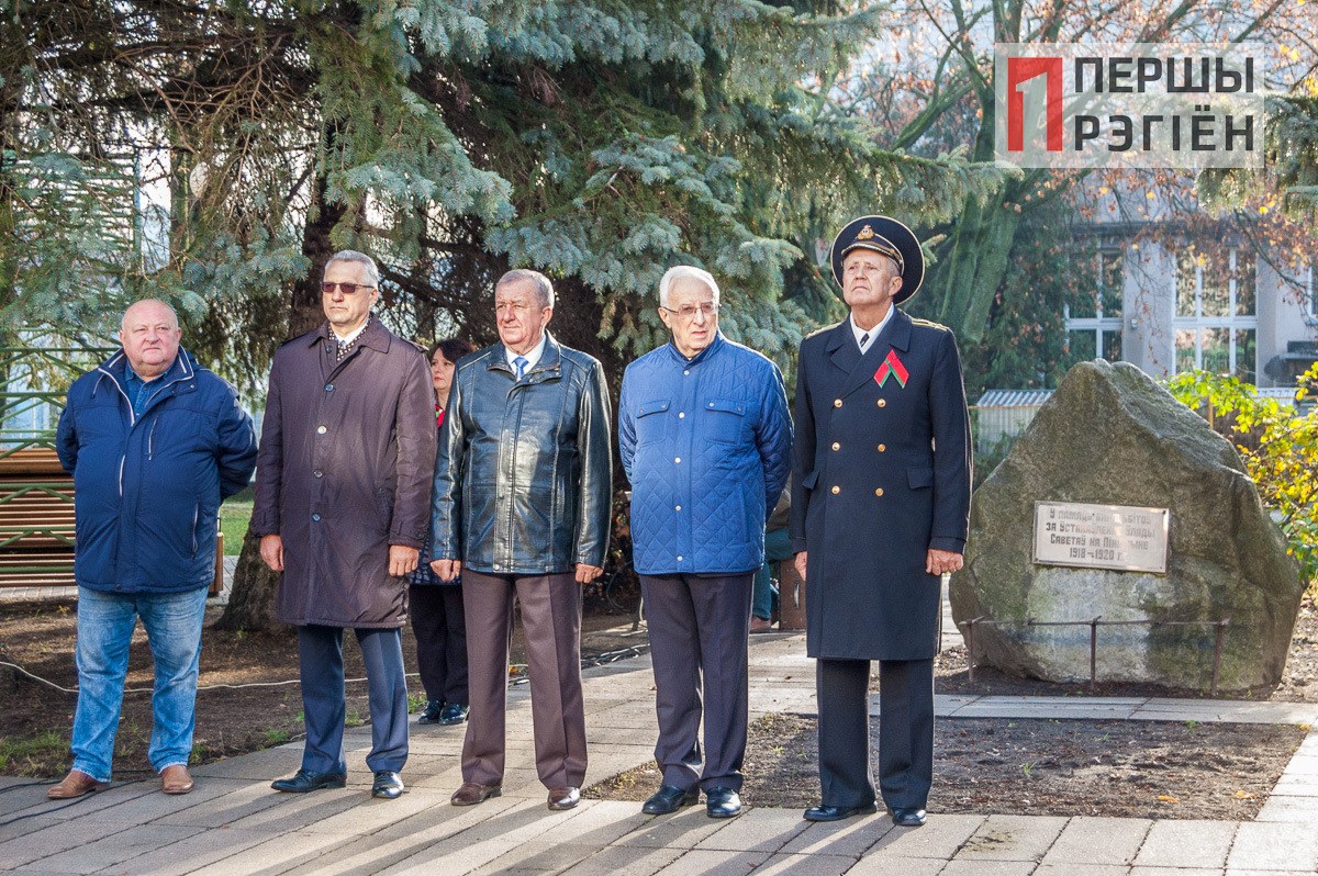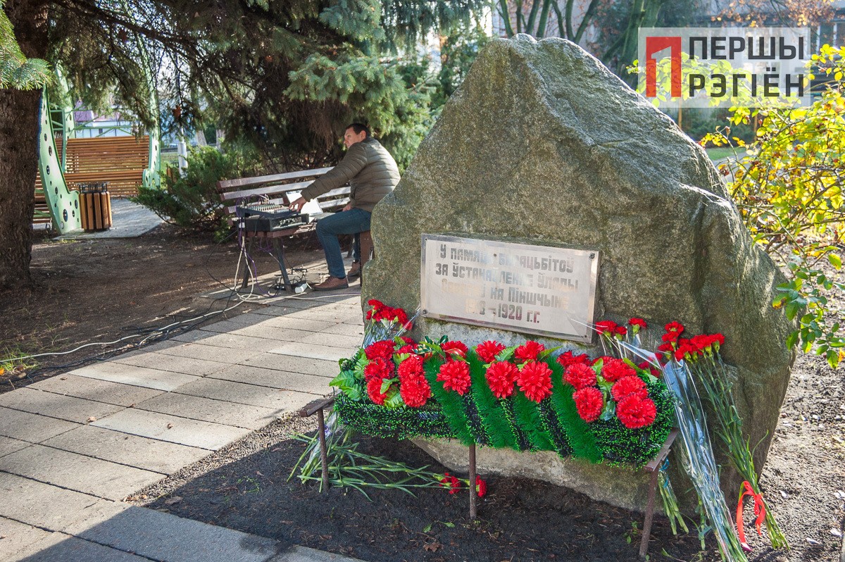 Здесь участники торжества возложили цветы к памятнику вождю мирового пролетариата, а затем процессия прошла по пешеходной улице Ленина и остановилась у памятного знака в честь борцов за установление советской власти на Пинщине.
