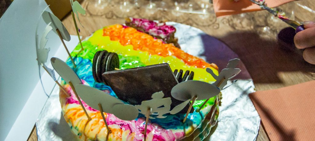 -Это торт, который символизирует весь процесс подготовки к экзаменам. Конечно, мы все откладываем на последний момент. Черная глазурь здесь символизирует всю беспросветность ситуации. Но вместе с тем, белые шарики на торте- это знания, которые, возможно, остались. Сама суть в том, что в конце ты ощущаешь сладкий вкус победы,— рассказала Полина Снитко, студентка второго курса, биотехнологического ф-та.