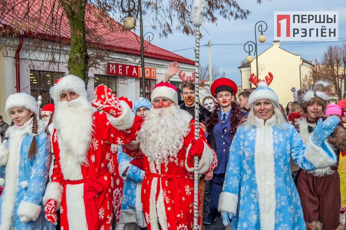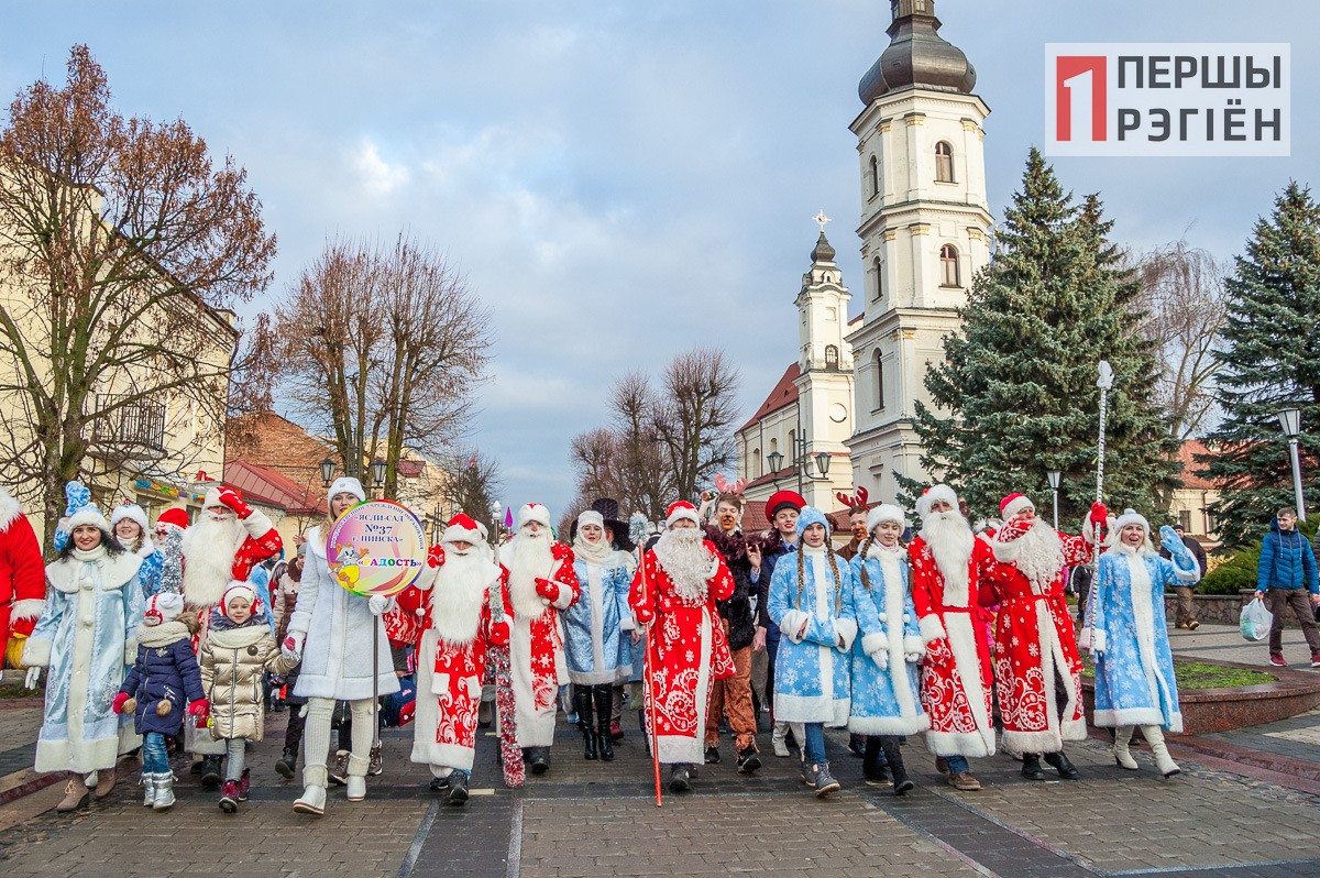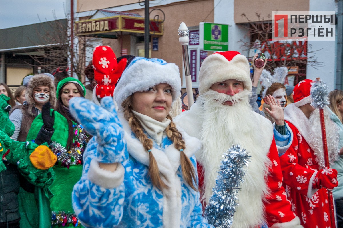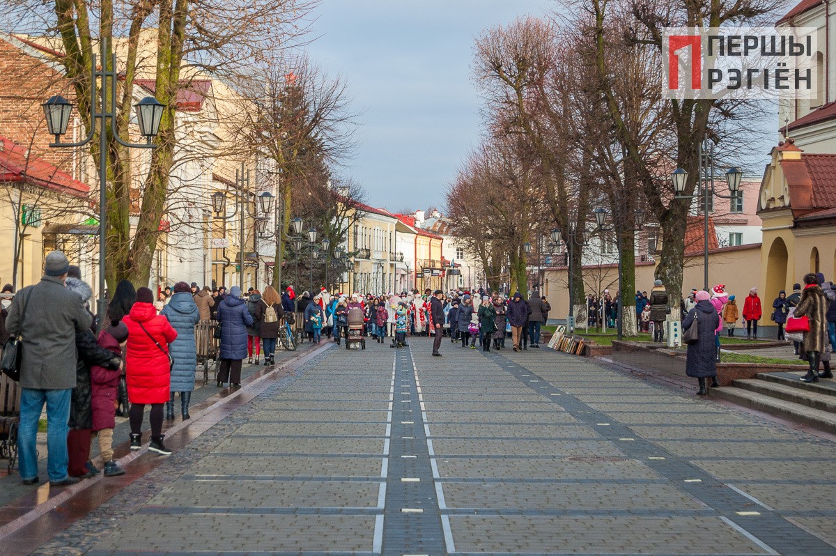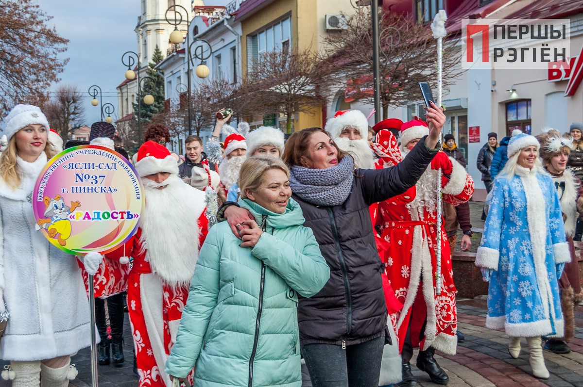 По улице Ленина прошел парад Дедов Морозов и Снегурочек. Его участники — представители разных организаций Пинска. Среди них: ясли- сад №5, № 9, № 37, педагогический и индустриально-педагогический колледжи, профессионально-технический колледж легкой промышленности и пинская центральная поликлиника.