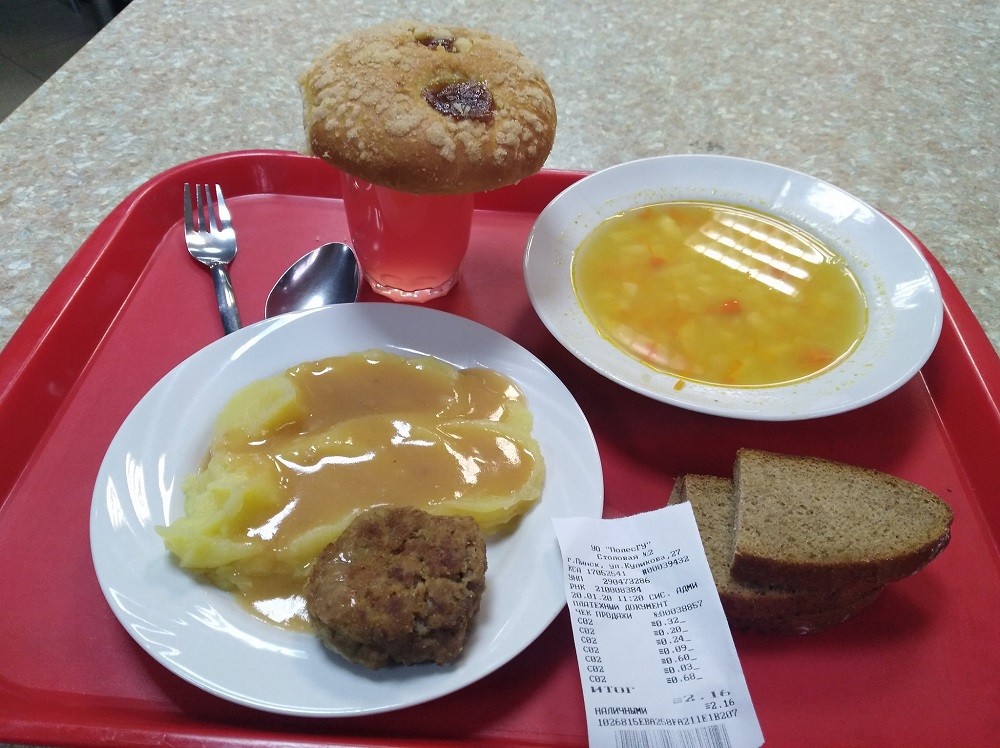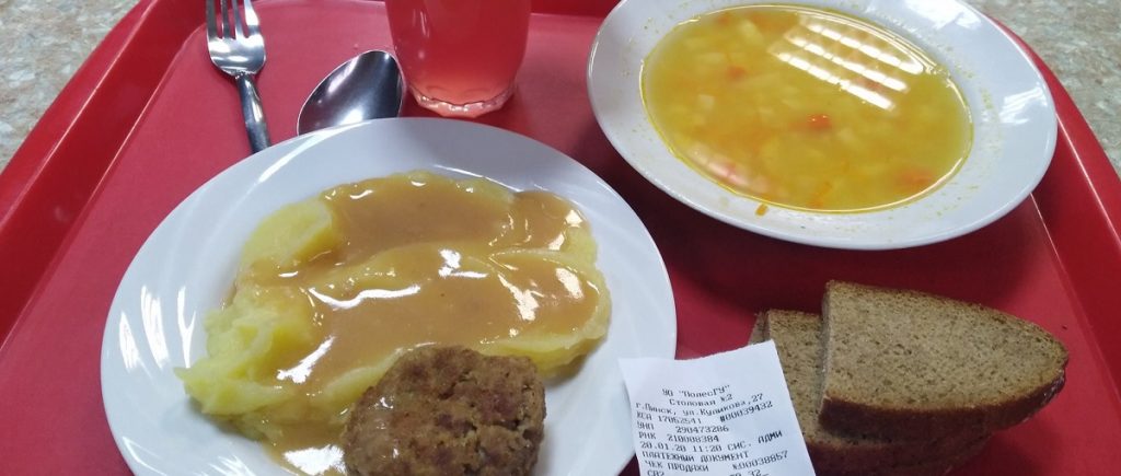 «Суп гороховый, картошка пюре, котлета особая 50 гр., подлива, 3 кусочка черного хлеба, кисель, булочка, вилка, ложка, 2 посуды, поднос, стол, стул, гардероб, тепло, туалет бесплатный, вежливое общение работников, экономия времени и денег», — так написал пинчанин о своих впечатлениях.