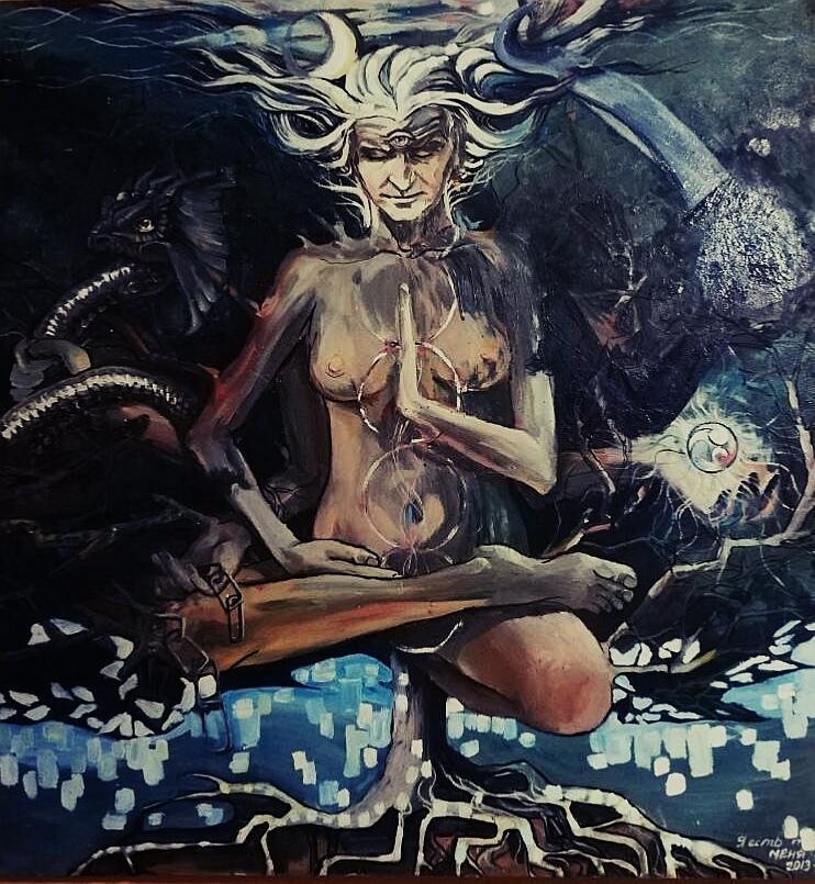 – Мои. Эти картины я вижу во снах. Я их не рисую долго. Зарисовываю то, что видела одно мгновение. Это быстрые мазки. Особо не заморачиваюсь: просто переношу увиденные картинки на холст или на бумагу, а потом дорабатываю, когда у меня есть на это время. В моих представлениях мир совсем другой, не такой, как нам рассказывают в школе или каким мы его видим по телевизору. Мой мир, моя Земля находятся в чаше, которая имеет свои корни, свою структуру и выход сверху. Это сложно объяснить. Я не претендую ни на какие истины. Это просто моё мировоззрение. Поэтому мой мир у меня внутри. Я стремлюсь не наружу, а обращаюсь вовнутрь самой себя.