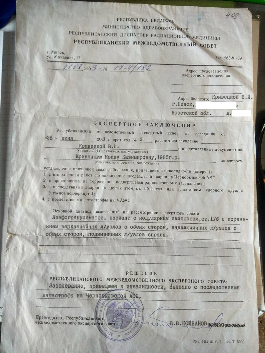 – Этот документ – мой приговор, который мне вынесли врачи… четвёртая Б стадия. Не знала, что у четвёртой бывают стадии. Поражение… Документ подтверждает, что заболевание, приведшее к инвалидности, связано с последствиями аварии на Чернобыльской атомной электростанции. Впоследствии мне был присвоен статус пострадавшей от катастрофы на ЧАЭС.
