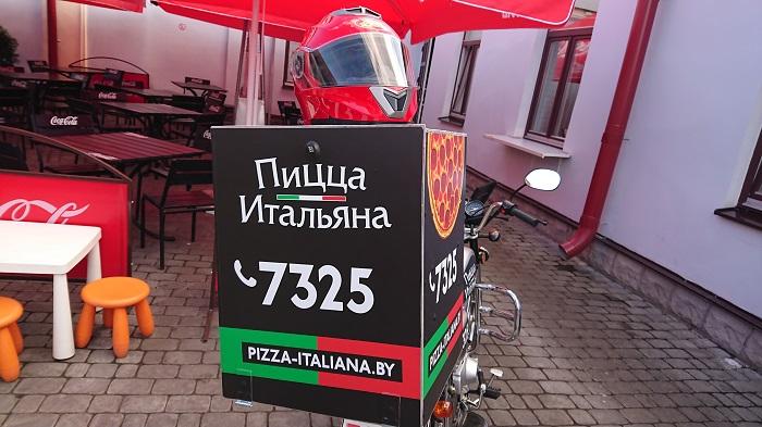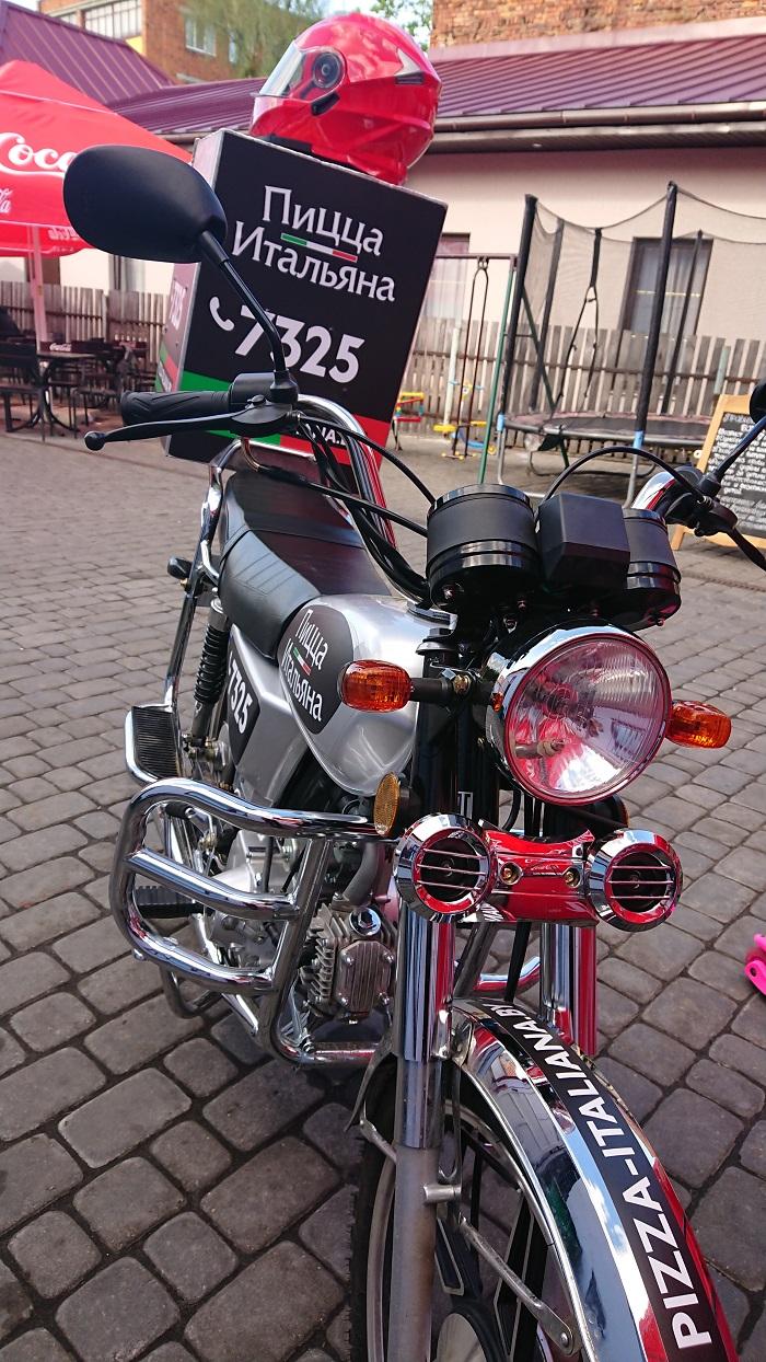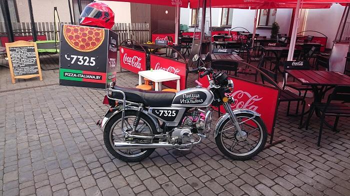 Когда автор этой статьи зашла на летнюю площадку пиццерии, этот новенький мопед с ящиком вместо багажника и привлек внимание. Доставщик еды уже был на старте и ожидал очередной заказ. Минута, две, три… И вот ароматная пицца уже в ящике, шлем на голове. Новенький мопед выскочил из ворот и стремительно понёсся по улицам к очередному клиенту.