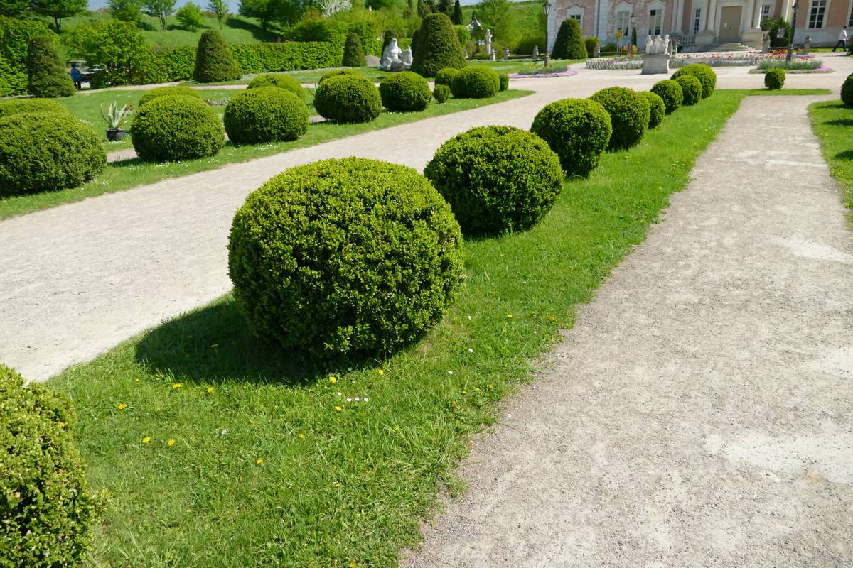 Если вы хотите получить самшитовый шар для начала сформируйте на нем направляющею поперечную дугу сверху. Уберите все отросшие ветви с главной направляющей линии. Вы должны достичь результата – глубокой дуги, которая будет видна со всех сторон. Затем от этой главной линии опускайтесь перпендикулярно вниз, получая, таким образом, дуги до основания куста. У вас должно получиться что-то типа глобуса с экватором и четырьмя вертикальными меридианами. Если вы все сделали аккуратно и получили ровные дуги, подстригите ветки на участках по такой же схеме.