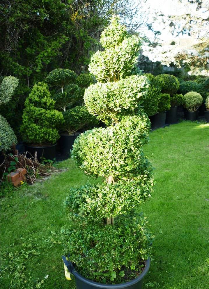 Это более сложная фигура, которая потребует от вас терпения и некоторых умений. Для начала формируем из куста конус или колонну, зависимо от желаемой формы спирали. Затем размечаем линии прохождения завитков яркой лентой или цветным скотчем. Для этого закрепите один конец ленты у основания кустарника, обмотайте его по спирали и закрепите другой конец на верхушке. Количество витков и ширина между ними может быть разной, зависимо от пожелания и высоты растения. Однако, чем гуще завитки, тем красивее форма.