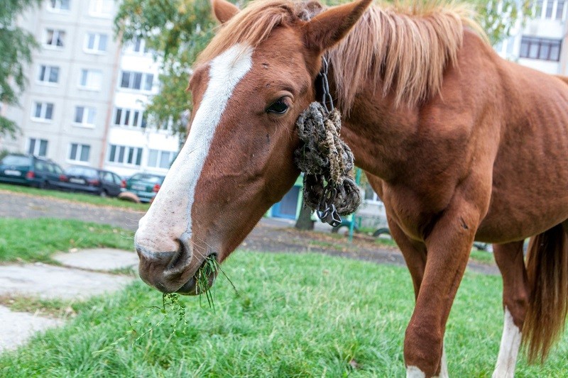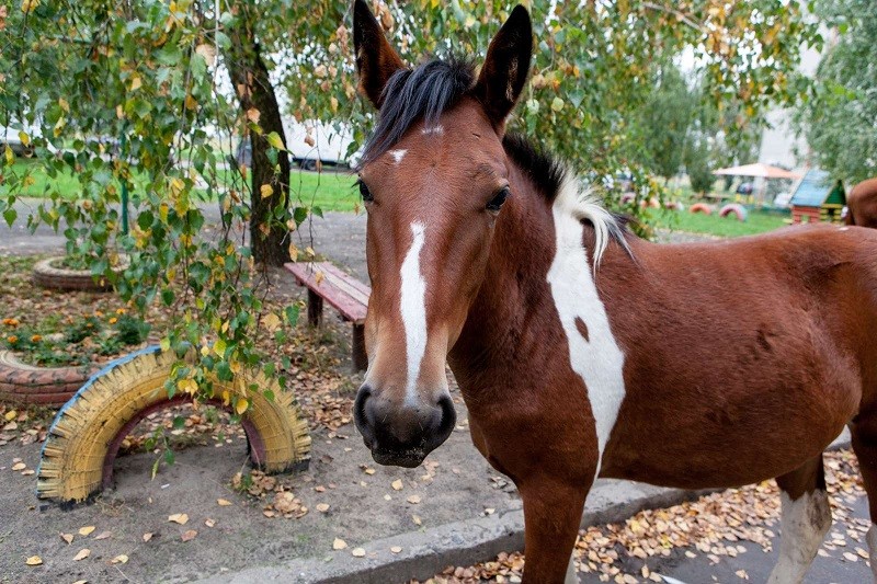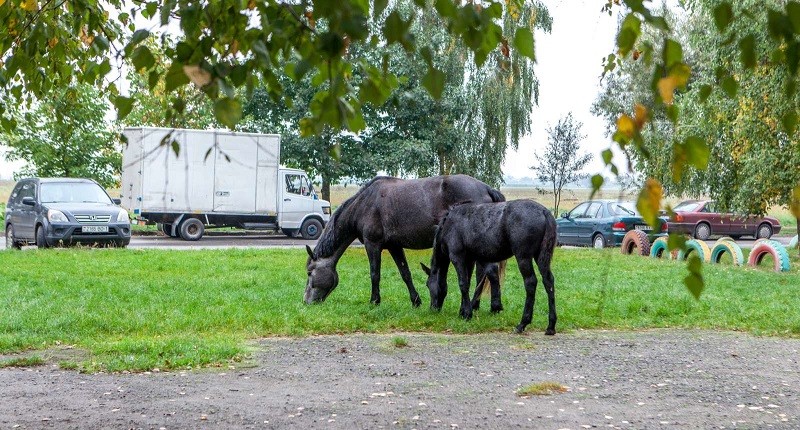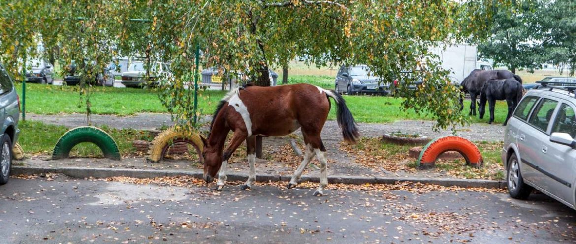 Во дворе на Костюшко 3 октября в 11.00 было оживление — веселый визг детей. Как рассказали местные жильцы, лошади прибились с соседней деревни Галёво. Кони мирно ходили и щипали травку на радость местной детворе.
