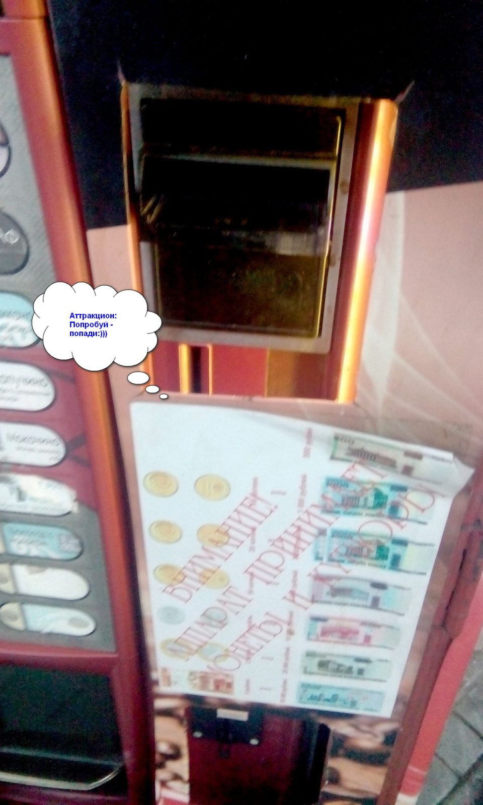 Но на беду наших гостей, попасть монетой в приемник (специальная щель в автомате) не так просто.