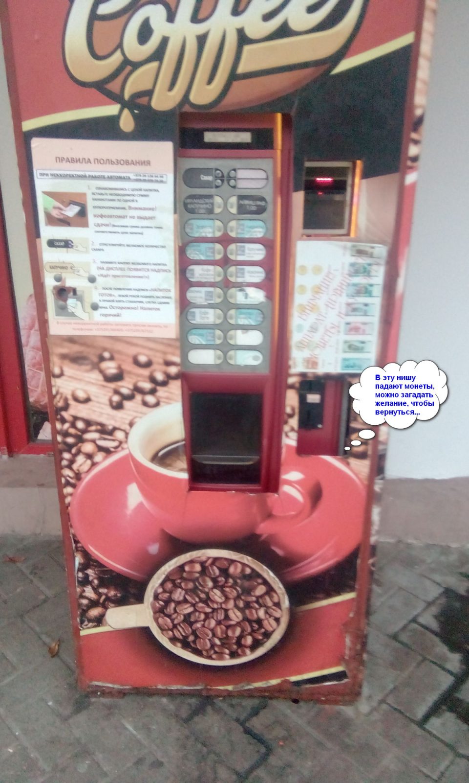 Аппарат на самом деле довольно древний, проржавевший местами, но вот эта табличка, которая мешает людям оплатить заказ, точно не на месте.