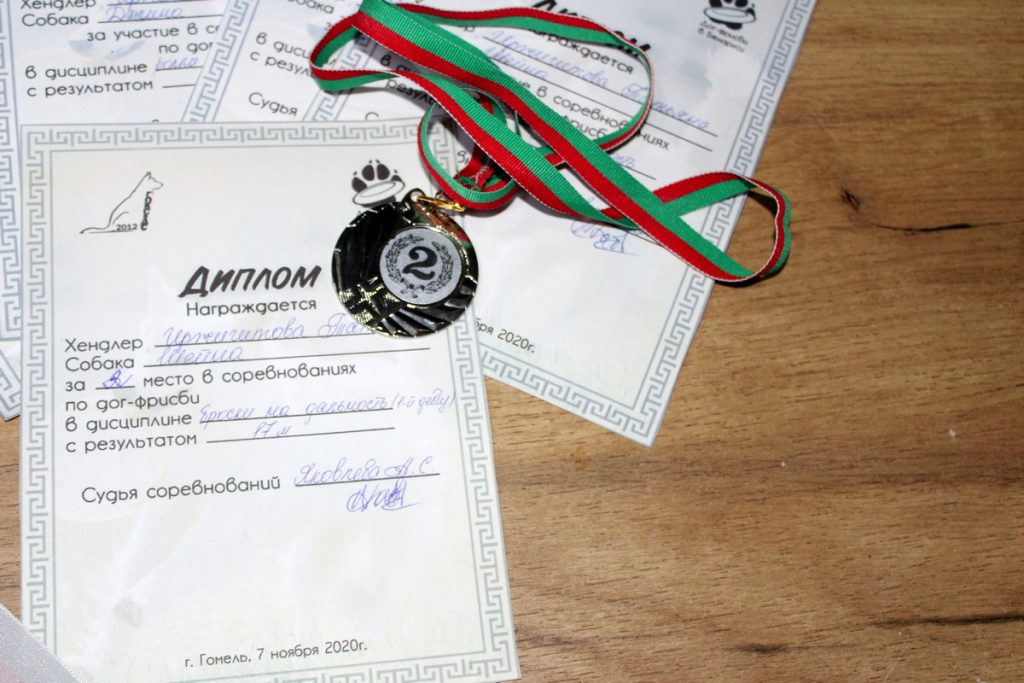 Было заявлено 25 команд со всей Беларуси. Мы участвовали в 4-х номинациях. Роллы точность — это, когда диск катится по земле и собака должна его схватить в бонусной зоне и получить максимальные баллы. Броски точность — по тому же принципу. Роллы дальность и броски дальность — чем дальше собака схватит диск, тем лучше.