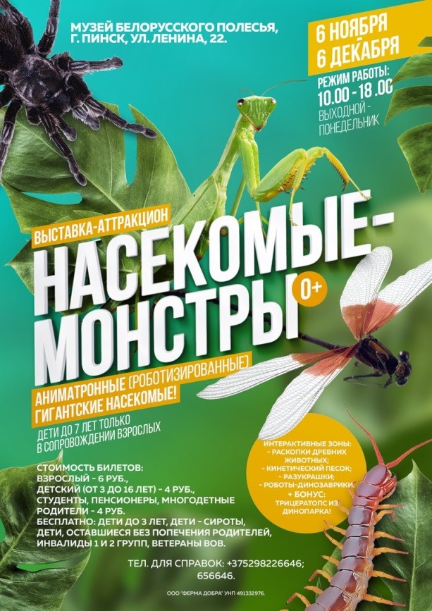 В музее Белорусского Полесья продолжается выставка «Насекомые-монстры», где представлены роботизированные гигантские насекомые. Прекрасная возможность провести время вместе с детьми. А после выставки можно всей семьей заглянуть в кафе «Лакомка» и полакомиться пирожными.