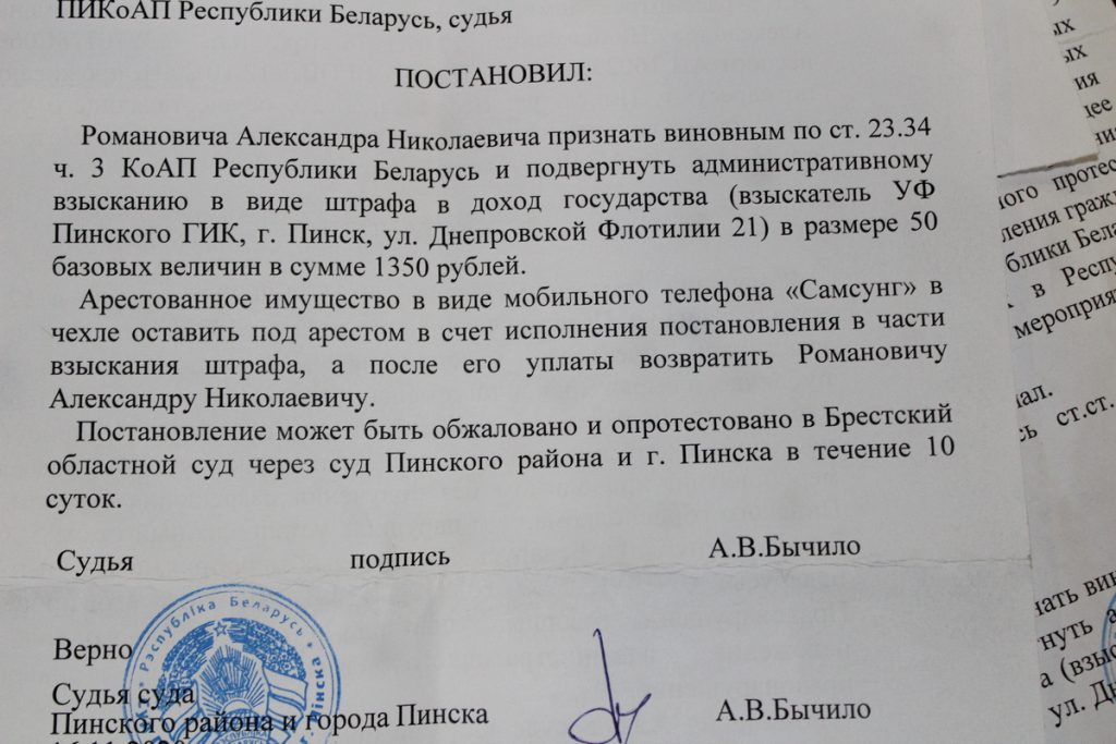 26 ноября после вынесения решения Брестским Областным судом по моей жалобе, вступило в законную силу решение суда Пинского района и города Пинска по штрафу в 40 базовых величин. Остальные – на стадии обжалования.
