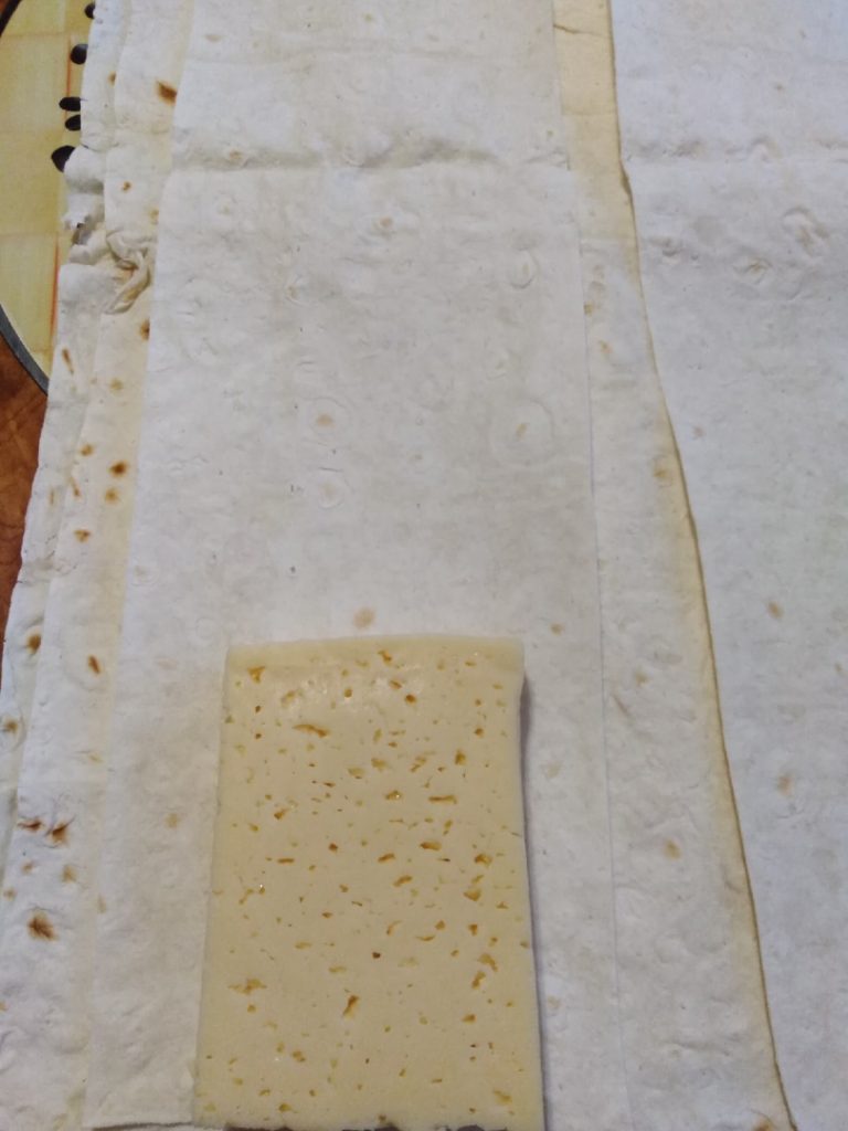 - На лаваш положите небольшие кусочки сыра и сделайте своеобразный конверт.