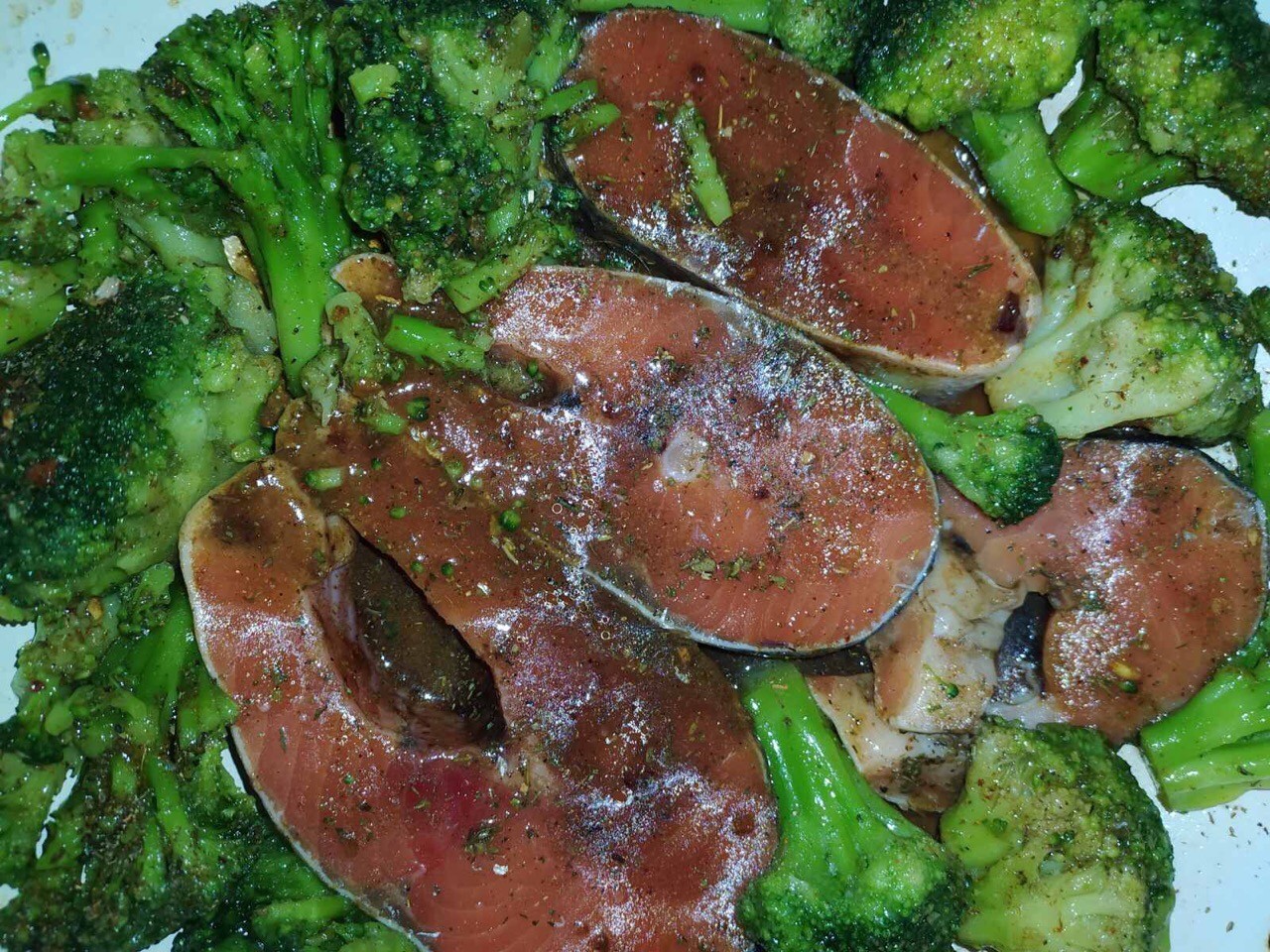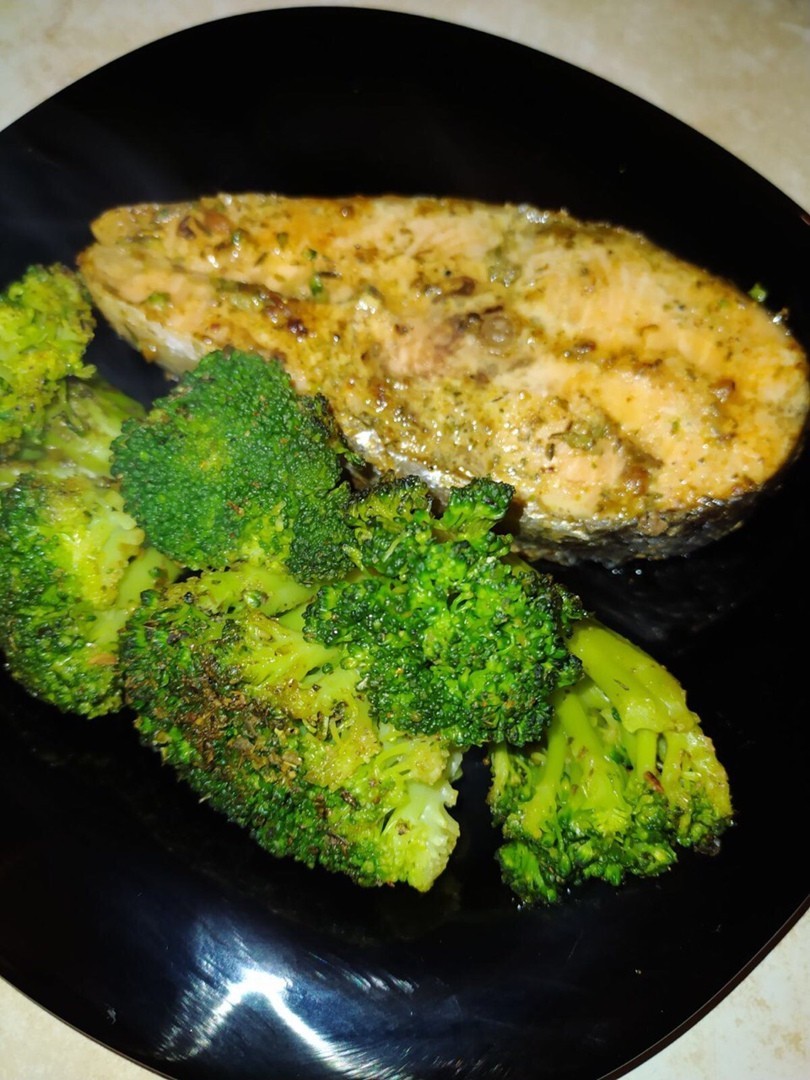 – Разогреваем духовку на высокой температуре. Добавляем чуть-чуть растительного масла (форель сама по себе жирная) на сковороду. Кладем замаринованные стейки из форели и оставшиеся замороженные брокколи. Добавляем чуть-чуть приправ.