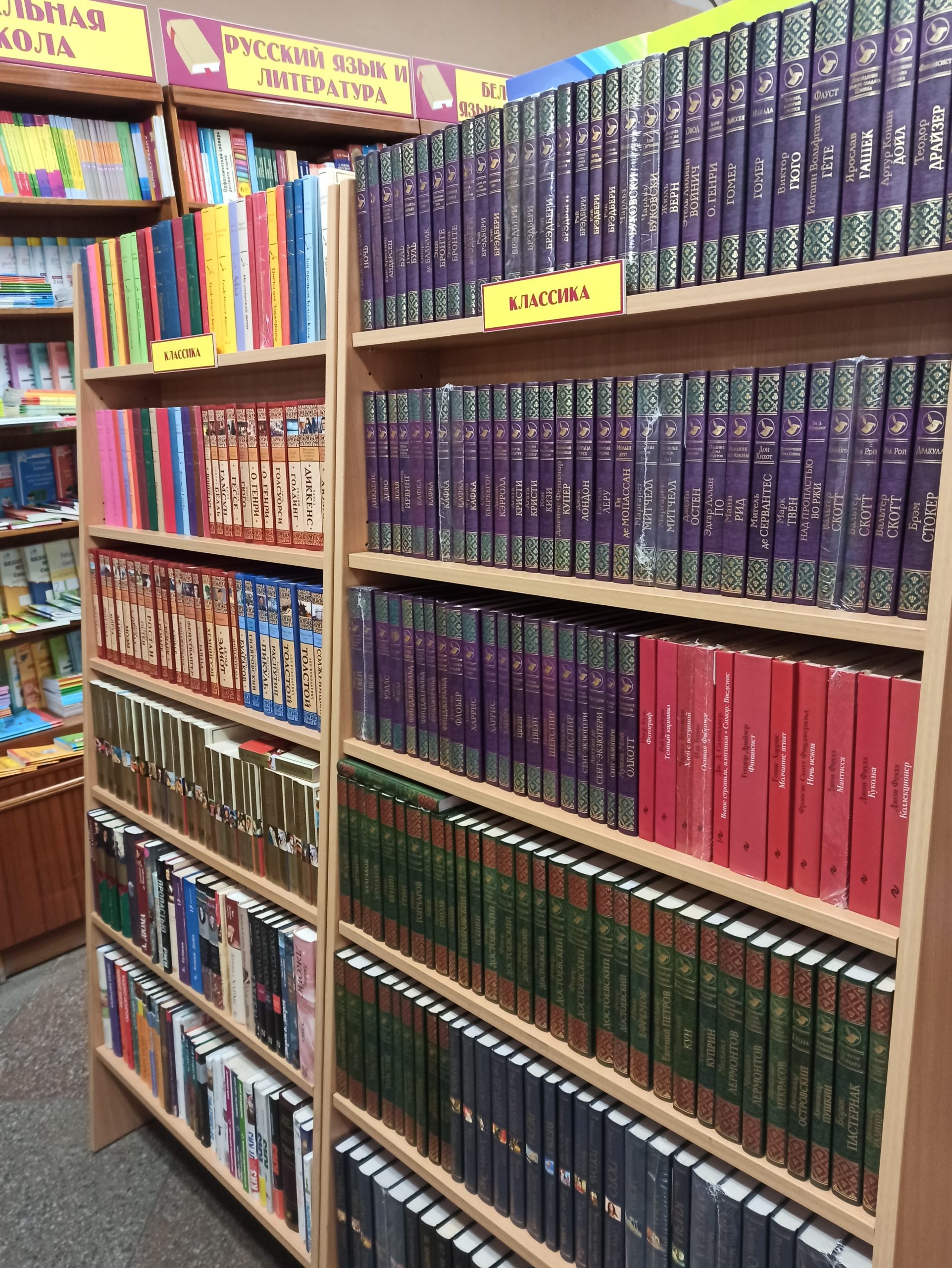 На входе сразу бросаются в глаза стеллажи с аккуратно расставленными, корочка к корочке, книги издательства «Азбука». Среди них можно найти большинство шедевров мировой литературы. Марк Твен, Эдгар Алан По, Шекспир, Антуан де Сент-Экзюпери, Бредбери, Гюго и Гомер.