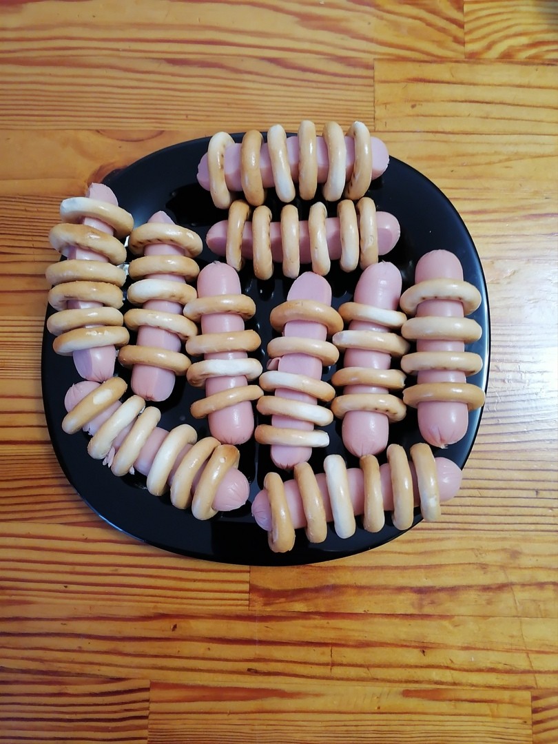 – Плотно нанизываем на сосиски сушки;