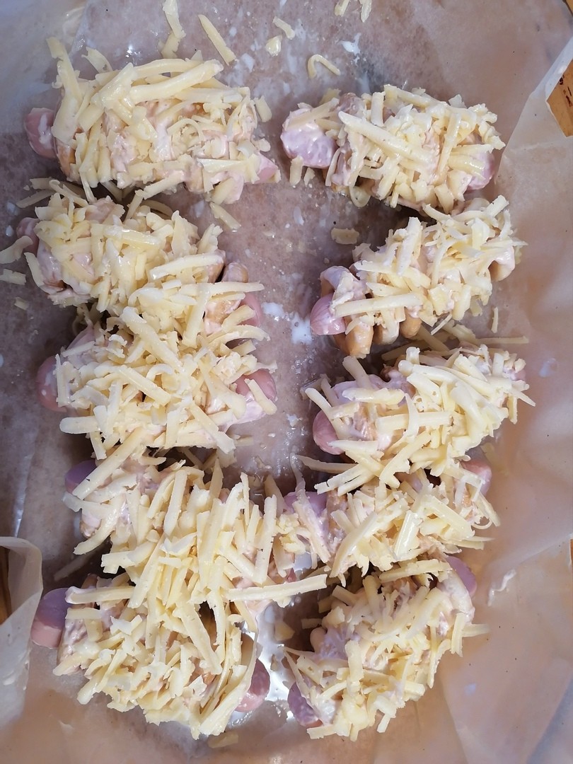 – Выкладываем на пергамент, добавляем сметану, соевый соус и приправы. Сверху посыпаем тертым сыром;