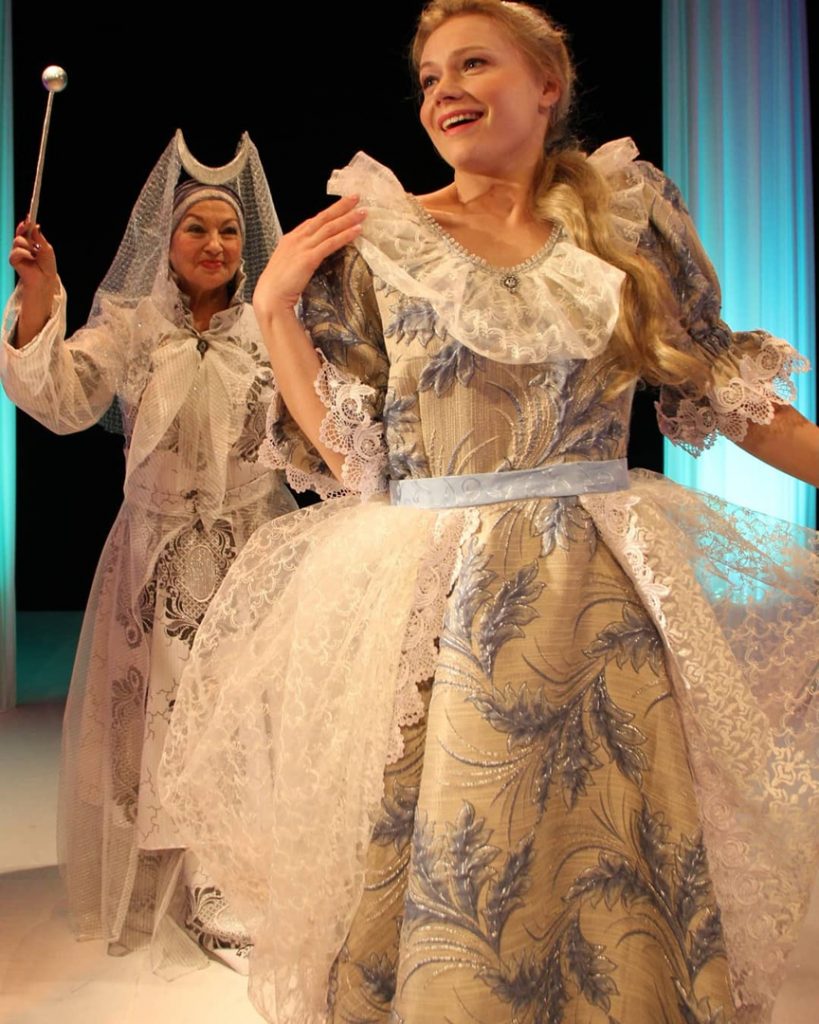 Очаровательный вид Татьяны из доброго детского спектакля про бедную трудолюбивую девушку. Образ удивляет и завораживает, ведь именно в этом моменте происходят сказочные превращения Золушки. Для Татьяны этот образ символичен. Он ассоциируется с трудом и борьбой в достижении собственных целей. Яркое пышное платье и тонкий белый пояс подчеркивает королевский образ Татьяны, а искренняя улыбка раскрывает нескрываемую доброту актрисы.