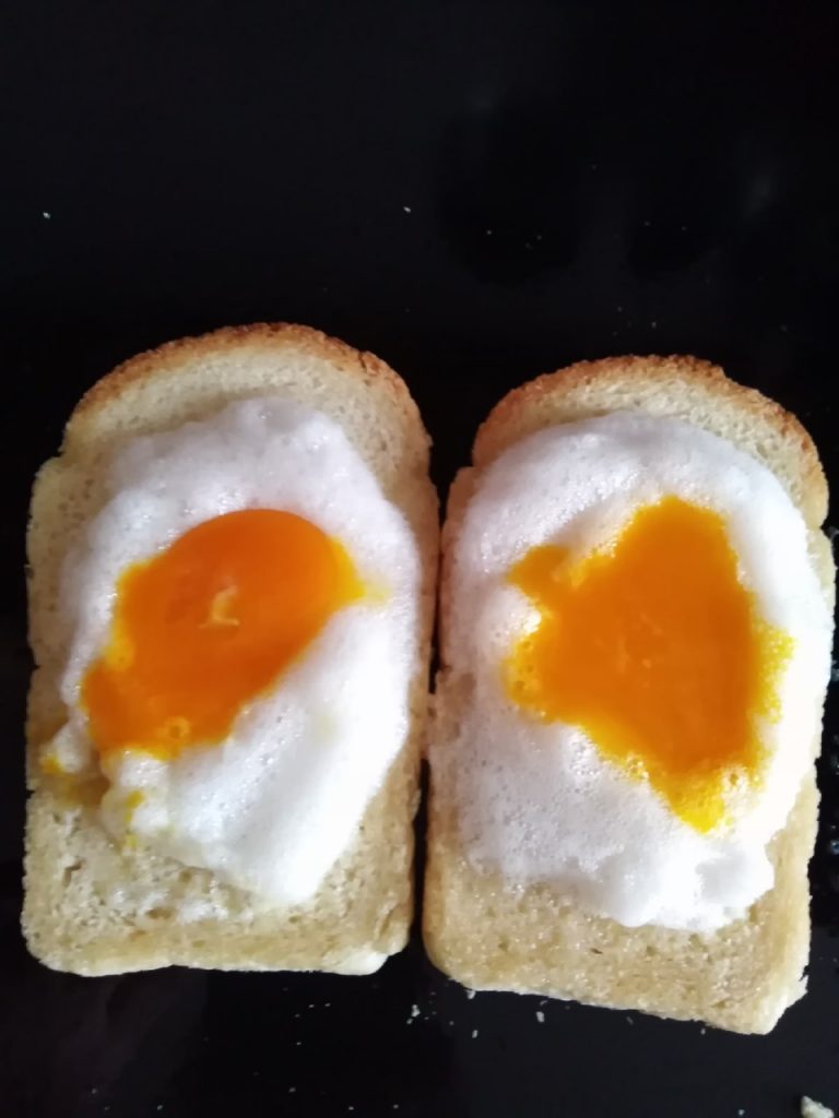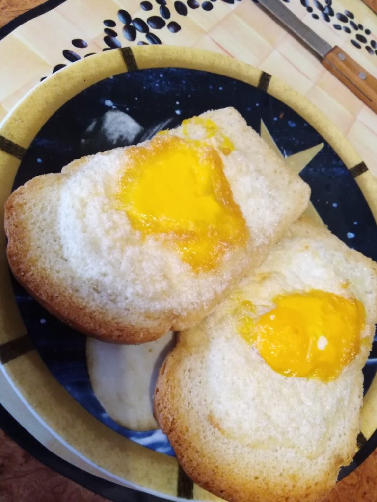 - На тосты аккуратно в виде кольца выложите взбитые белки, а внутрь опустите отделенные ранее желтки.