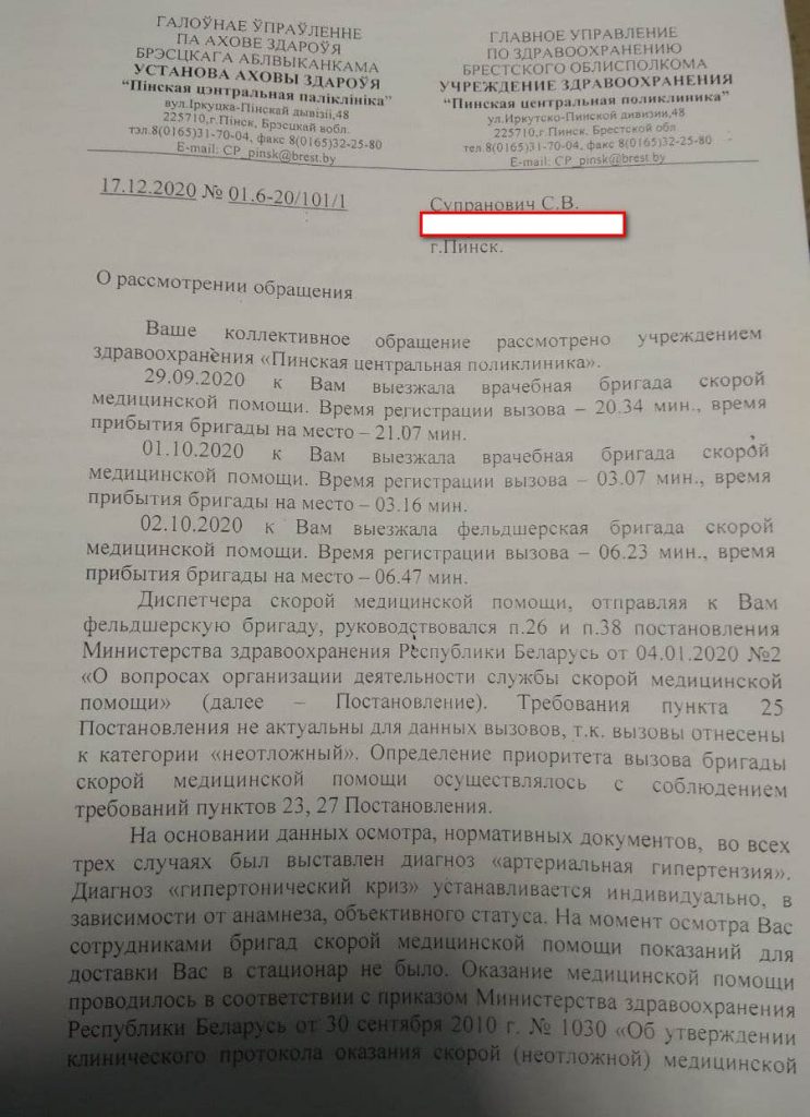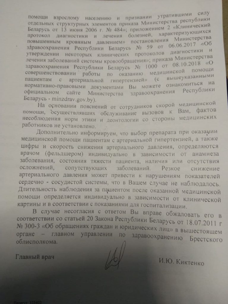 А вот что ответил главврач УЗ «Пинская центральная поликлиника» Киктенко И. Ю. на заявление Сергея Супрановича: