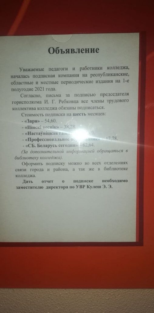 Не сложно отыскать в Сети, что речь, быстрее всего идет об учреждении образования «Пинский государственный профессионально-технический колледж легкой промышленности» и контролирует ситуацию с подпиской в нем заместитель директора по учебно-воспитательной работе Кулеш Эрика Эрнестовна.