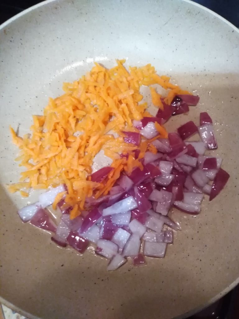 - Измельчаем с помощью крупной терки морковь и нарезаем мелко красный лук. На сковородку выливаем немного подсолнечного масла и поджариваем сразу лук порядка 3-х минут. Далее добавляем морковь – также держим на огне 3 минуты.