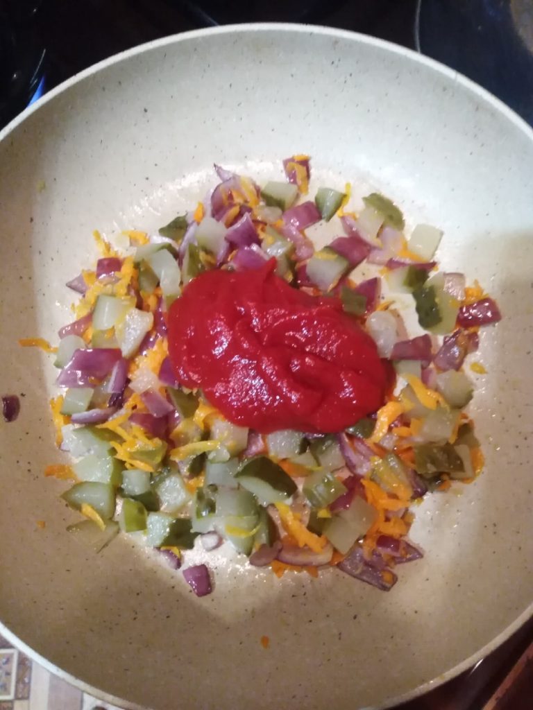 - Добавляем порезанные огурцы и томатную пасту. Все хорошо перемешиваем и жарим 5 минут на небольшом огне.