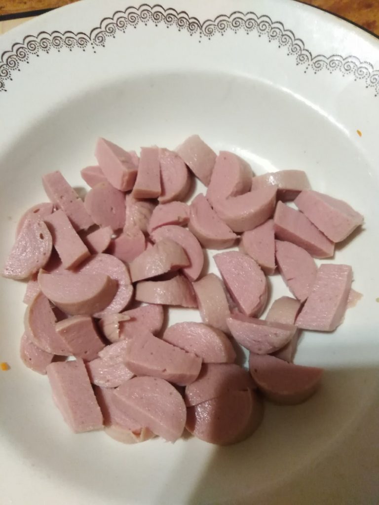 - Крошим на доске 2 сосиски и добавляем в суп.