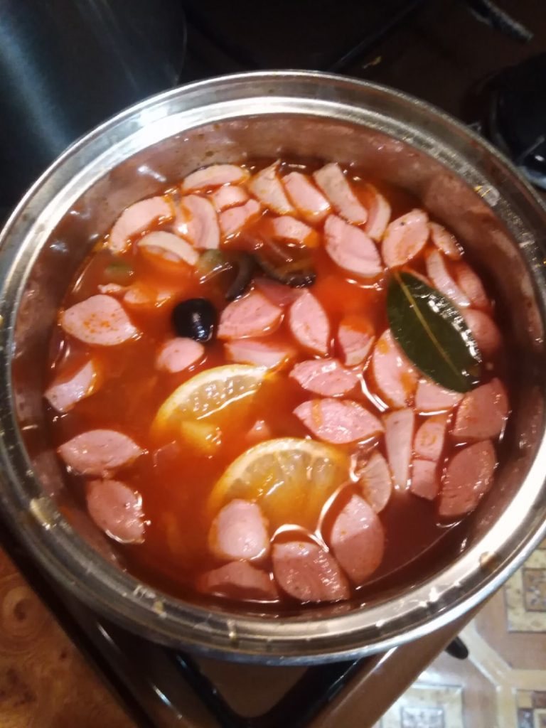 Через 3 минуты выключаем огонь и даем солянке настояться. Послепраздничный суп готов к применению! Приятного аппетита!
