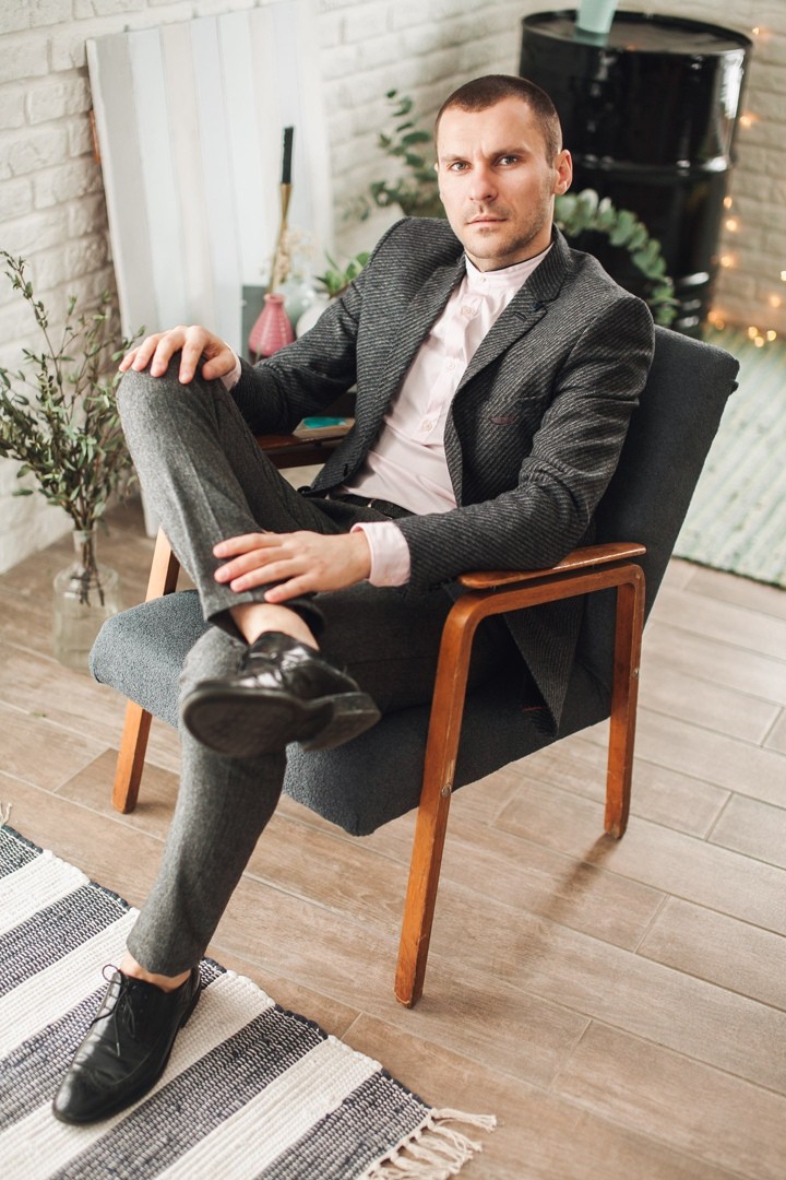 В данном случае Дмитрий использует классические штаны светло-серого цвета с пиджаком тех же тонов и материала. Черные туфли и светло-розовая рубашка доводит образ до логического завершения. Дмитрий грамотно составил весь классический образ, ведь мужчинам спортивного телосложения следует использовать модель однобортного пиджакаи брюки прямого покроя. Мужские стилисты считают, что консервативный и строгий стиль можно разбавить модными аксессуарами. Цепочек или часов здесь Дмитрий не использует.