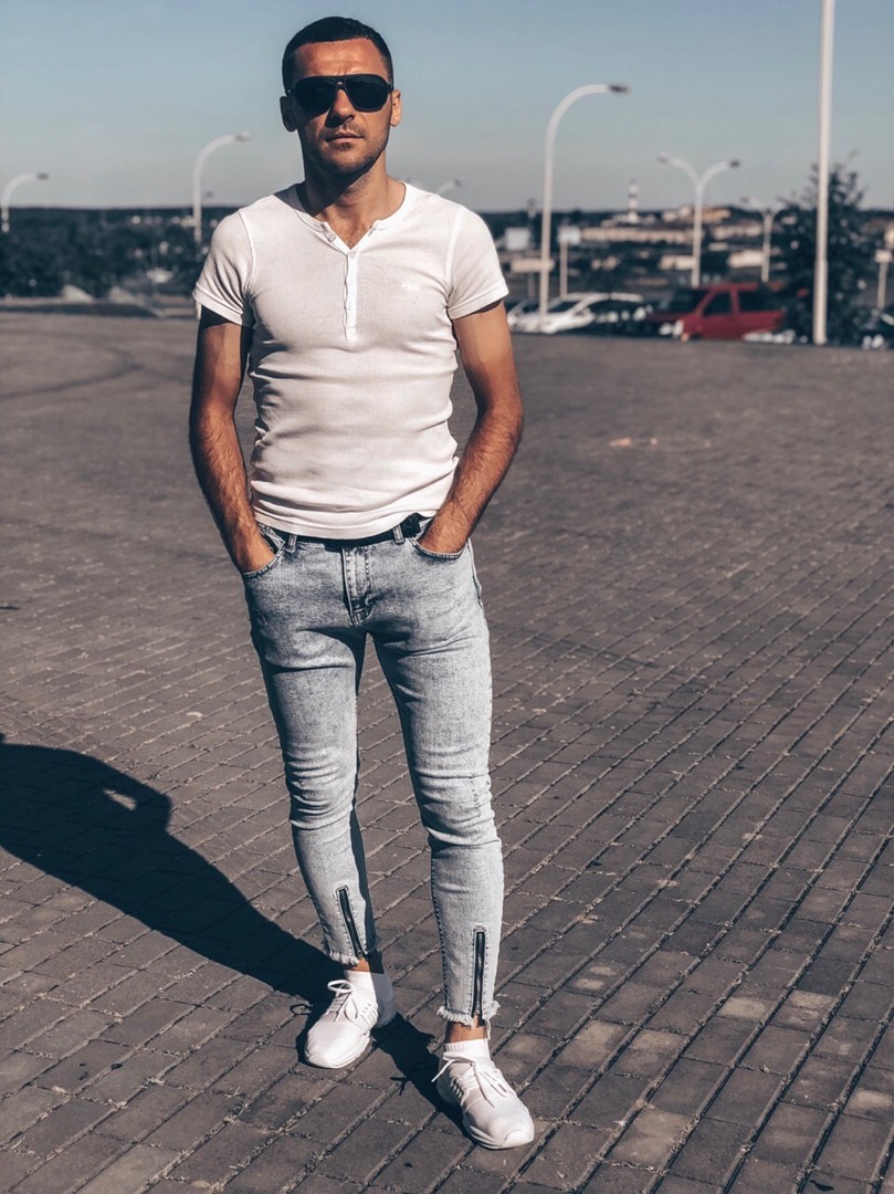 «Стильно, модно, молодежно». Часто используемая характеристика образов, которая часто в полной мере объясняет выбор одежды. Так и в данном случае. Белая майка с треугольным вырезом является незаменимым элементом любого мужского стиля. Она значительно удлиняет шею и подчеркивает черты лица. А еще она стала популярной у любителей здорового образа жизни. Как например, она популярна и у футболистов, как в данном случае.