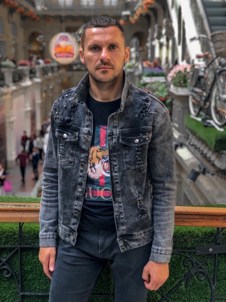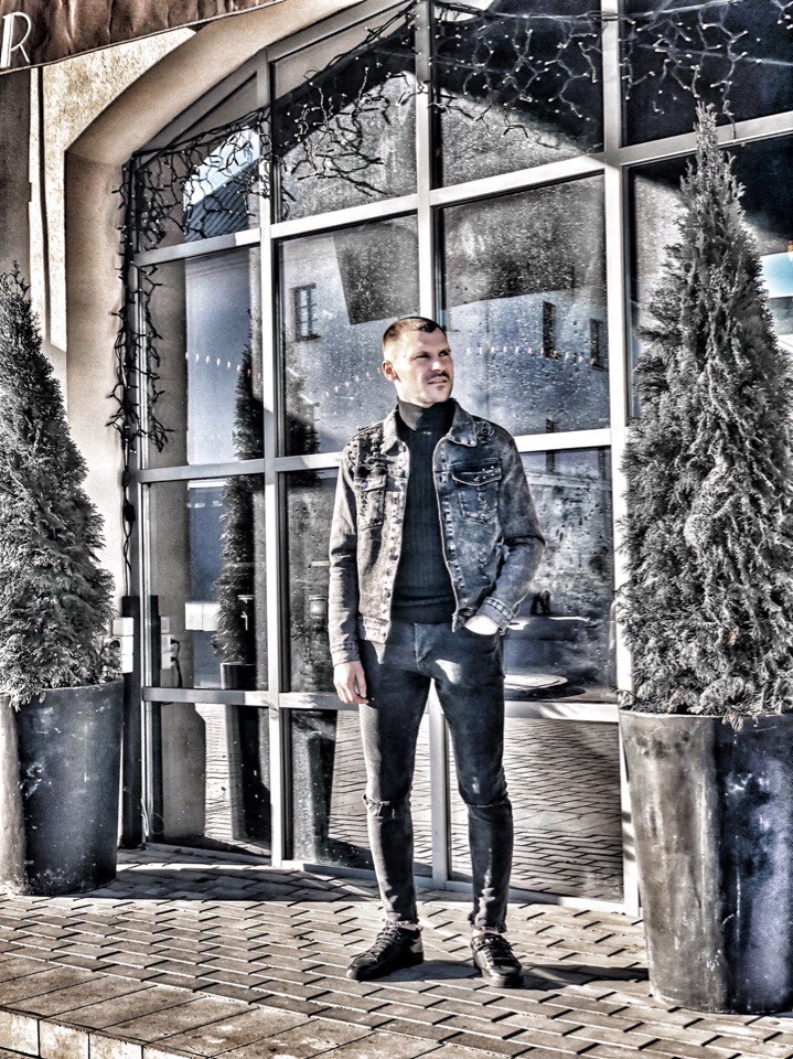 Стиль, популярность которого уже постепенно отходит и забывается. Он удобен, прост и рационален. Классические джинсы и куртка из грубого материала того же материала. Образ характеризуется собранностью, ведь в этом случае он формирует четкий силуэт и строгую посадку по фигуре. В образе Дмитрия куртка светлого денима сбалансировано смотрится с более темными цвета низа. Черная майка с ярким принтом «Gucci» дополняет моду этого и без того популярного образа.