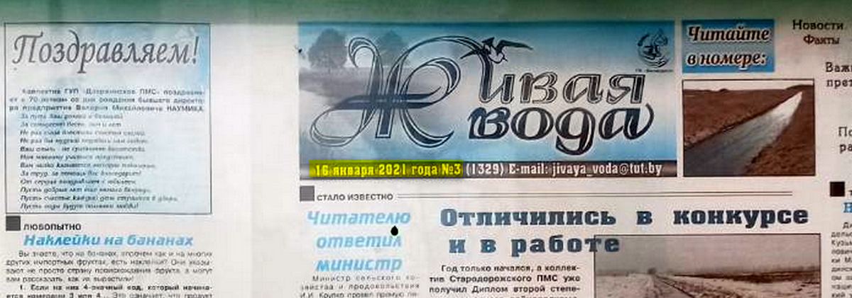 Свежий выпуск корпоративного издания «Белводхоза» «Живая вода» датирован 16 января 2021 года. До субботы еще несколько дней, а мы уже можем узнать, о чем поведал министр сельского хозяйства читателю, а также кто в Жлобине делегирован на Всебелорусское собрание.