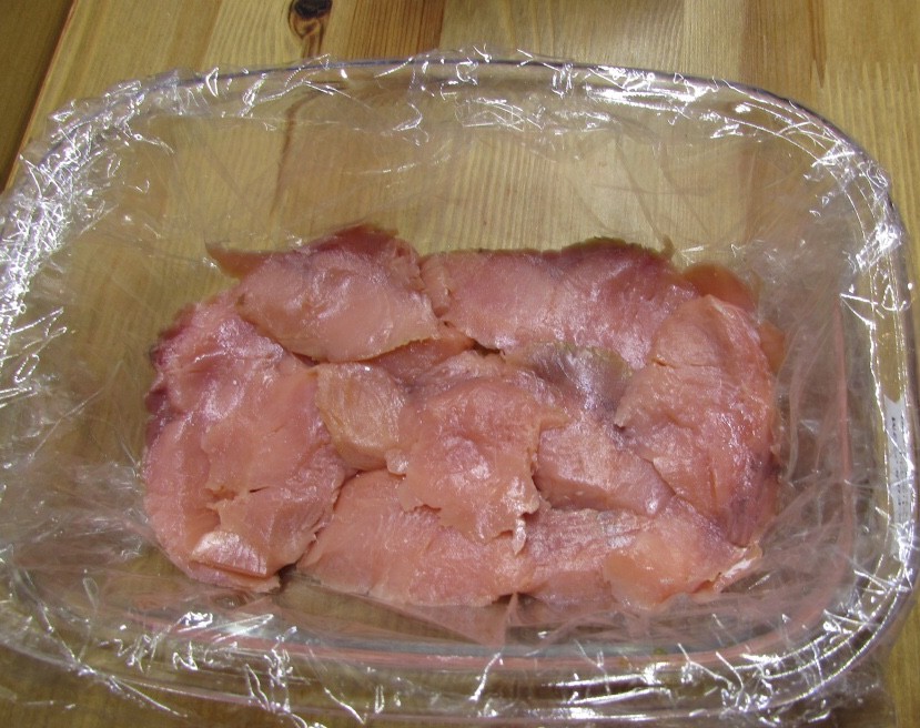 -Форель режем кубиками, выкладываем в форму, предварительно застелив её пищевой плёнкой;
