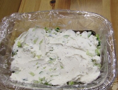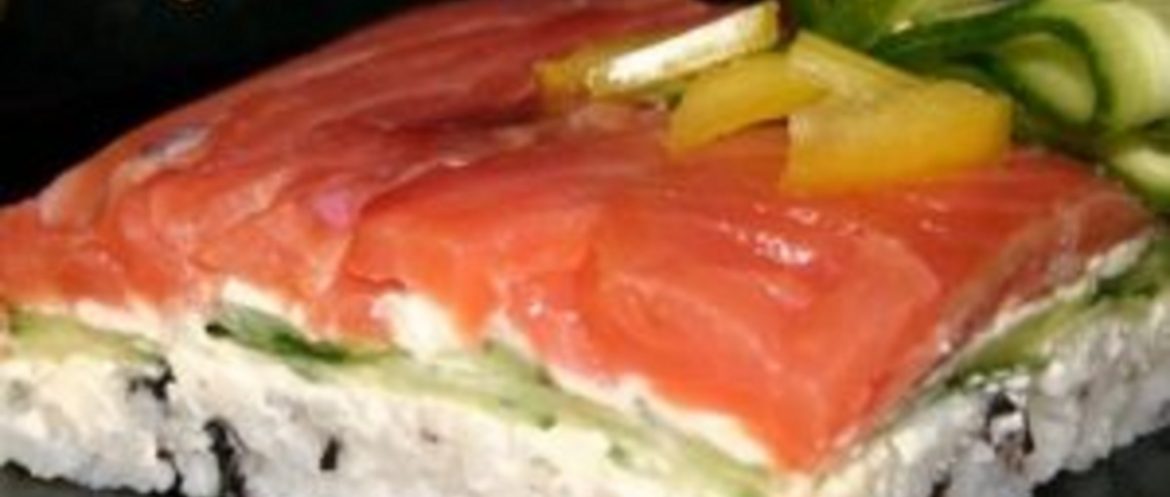-Вторым слоем выкладываем равномерно рис, добавляем творожный сыр и застилаем листами норм;