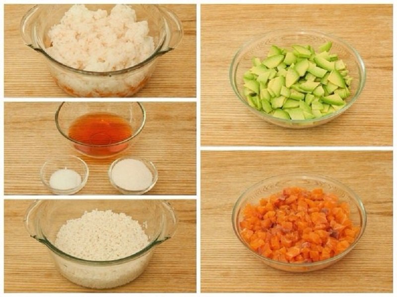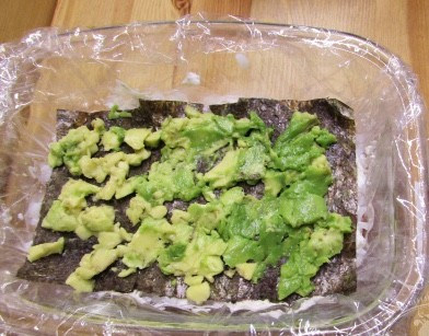 -Авокадо и огурец нарезаем кубиками, добавляем творожный сыр и застилаем листами нори, равномерно распределяем рис;
