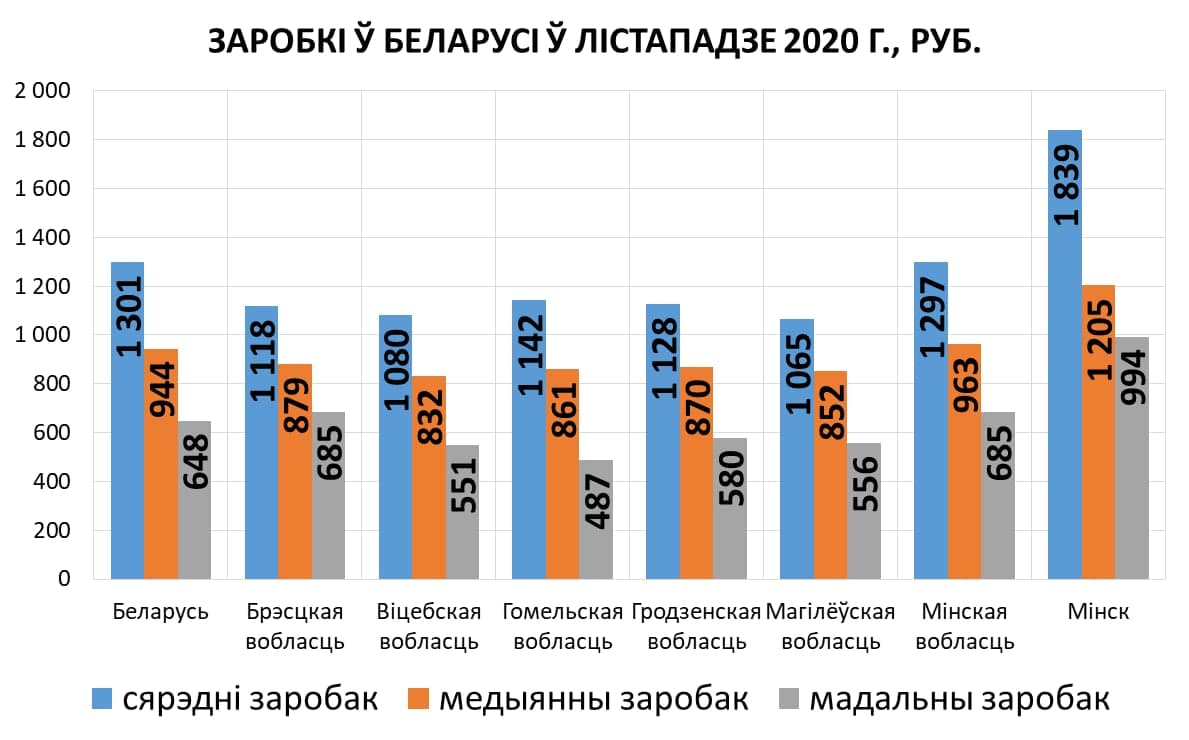 По данным Белстата медианная зарплата в республике в ноябре 2020 составила 944,4 руб, что в эквиваленте составило 72,6% от средней зарплаты за тот же период. Как отмечает Телеграм-канал «Эканоміка»: