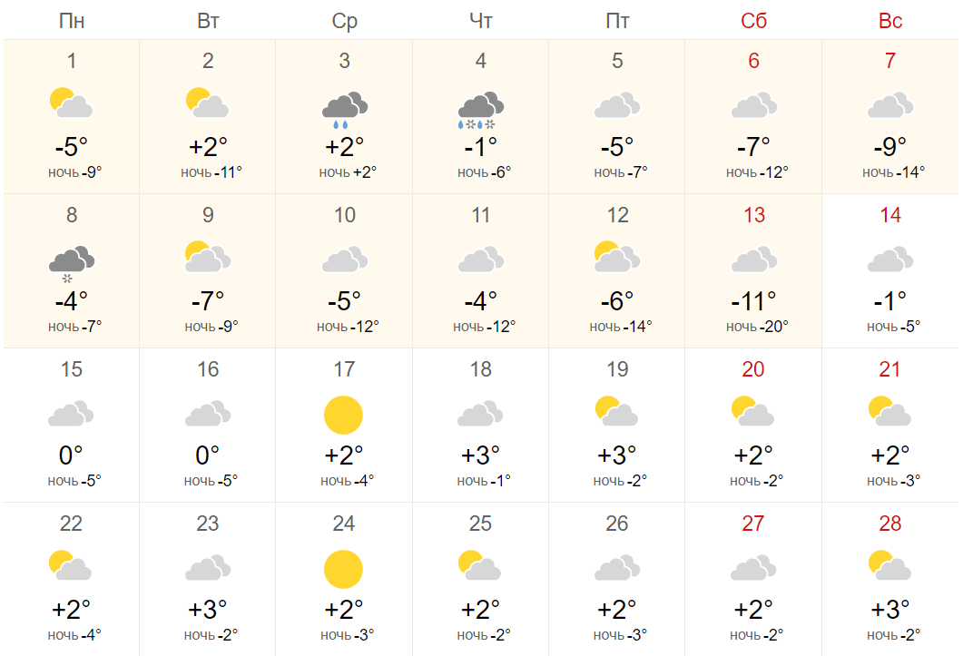 1 февраля ночью подморозит до – 4 градусов, а днем температура поднимется до нулевой отметки, достигнув к вечеру +2 градуса.