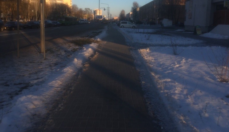 Вышел как обычно, но в итоге опоздал на свой автобус. Почистили пешеходную часть для виду, сделав только маленькую полосу для движения людей. И по снегу невозможно идти».